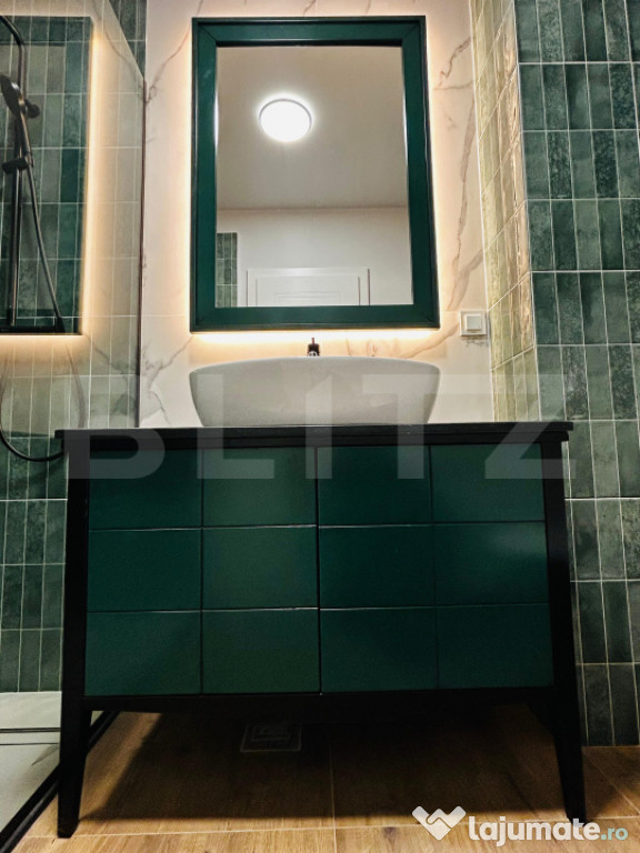 * **Bucătărie complet mobilată și utilată LUX**, cu mobilier de calitate superioară, dotat cu amortizare, iluminare LED cu soft touch și electrocasnice moderne (inclusiv mașină de spălat vase)