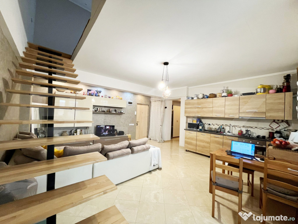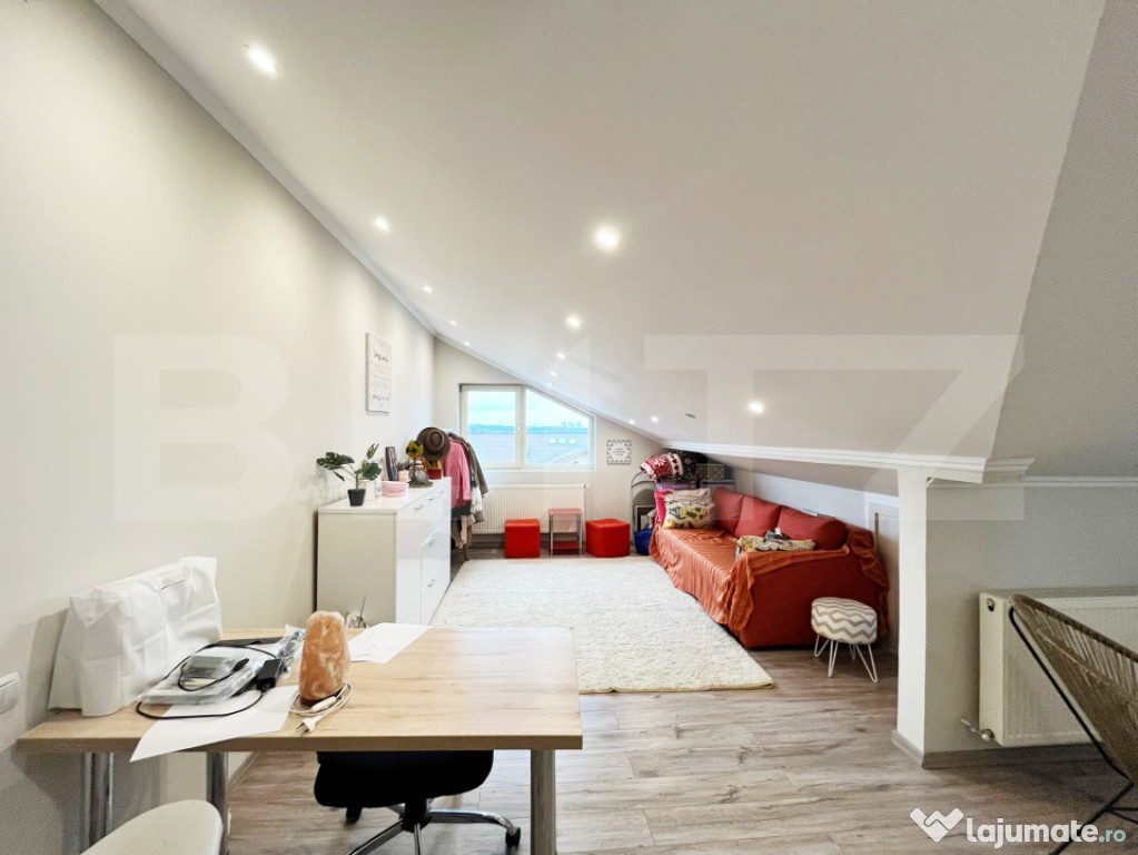 Compartimentarea include o bucătărie open-space cu living și un balcon generos de 6 mp, 2 dormitoare, 2 băi, plus zona suplimentară de la mansardă, ideală pentru depozitare, hobby sau birou. Apartamentul dispune de 2 locuri de parcare – unul subteran și unul suprateran.