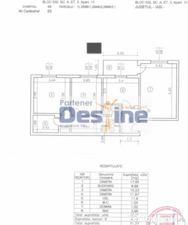 DESTINE IMOBILIARE vă prezintă pentru vânzare:Apartament 3 camere – 72 mp – DECOMANDAT – Etaj 3/4 – Zona Canta
