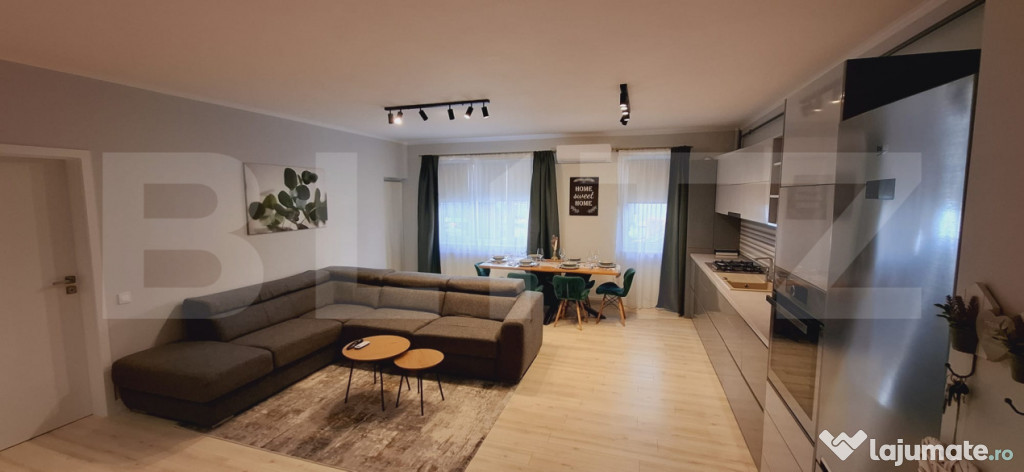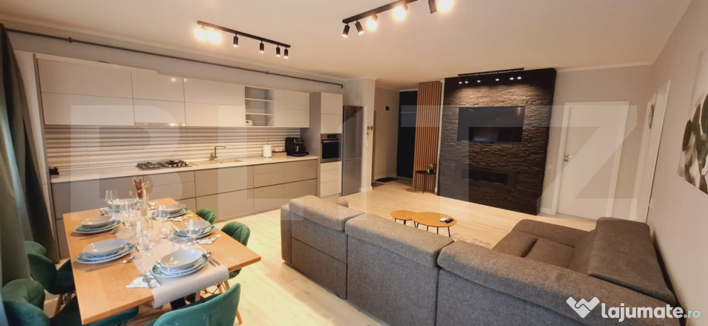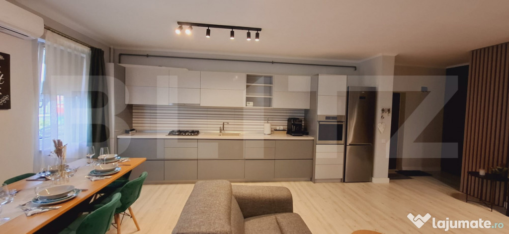 Living generos cu bucătărie open-space, complet mobilată și utilată