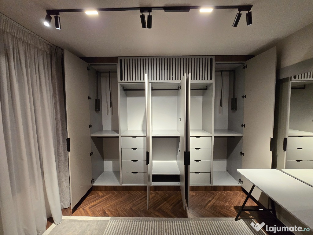 Un dormitor parțial nemobilat — are dressing pe toată lungimea peretelui + birou; se poate mobila după preferințele chiriașului.