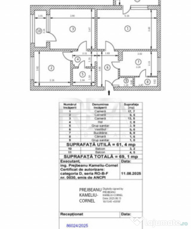 Suprafata totala de 69,1m.p, din care suprafata utila 61,4m.p, balcoane 7,7 m.p.