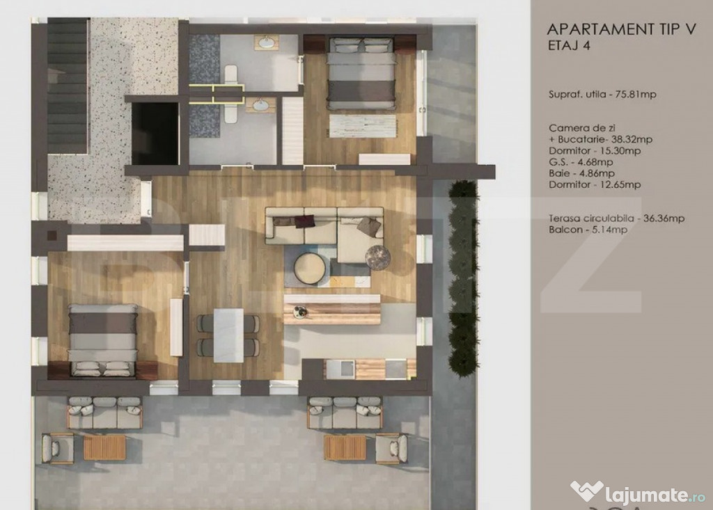 Compartimentare: living cu bucătărie open-space, 2 dormitoare, 2 băi, balcon și terasă spațioasă