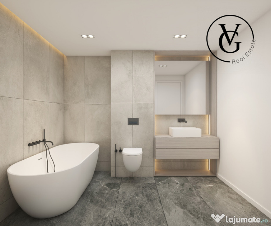 -Instalații sanitare/băi: racorduri apă/canalizare, contorizare apă rece, placare cu ceramică la 240 cm înălțime, obiecte sanitare baie/băi (rezervor wc încastrat, cadă freestanding/duș cu sticlă securizată și rigolă, lavoar pe blat, baterie lavoar, baterie cadă/duș, calorifer portprosop)