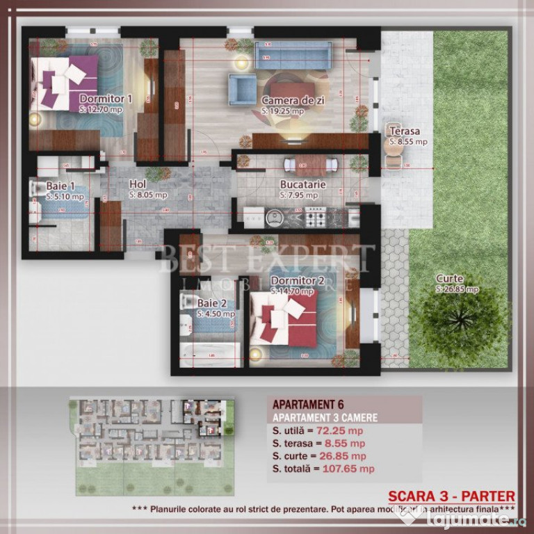 Suprafata utila -72.25 mp utili +8.5 mp balcon, total 80.8 mp utili, gradina 26.85