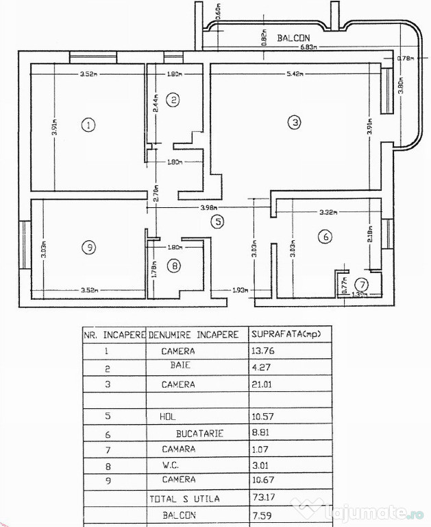 Apartamentul de 3 camere decomandat se afla pe Soseaua Arcu, intr-un bloc de "tip vila" cu regim de inaltime de P+ 2-3E, la etajul 1. Blocul a fost finalizat in 1996.Apartamentul, in suprafata de 73.17mp+ balcon de 8mp, este compus din: