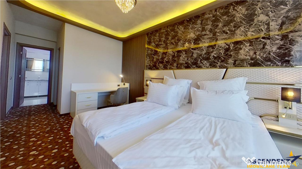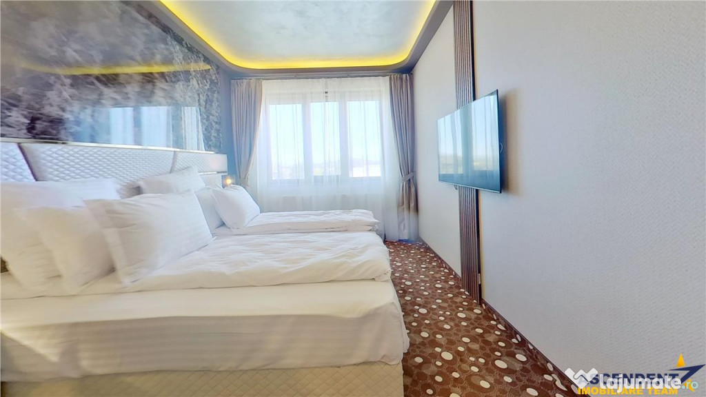 - Dormitor matrimonial: Mobilat cu birou, cu acces catre dressing si baie, pat king size (200x200cm) cu saltea ortopedica si draperii black-out.