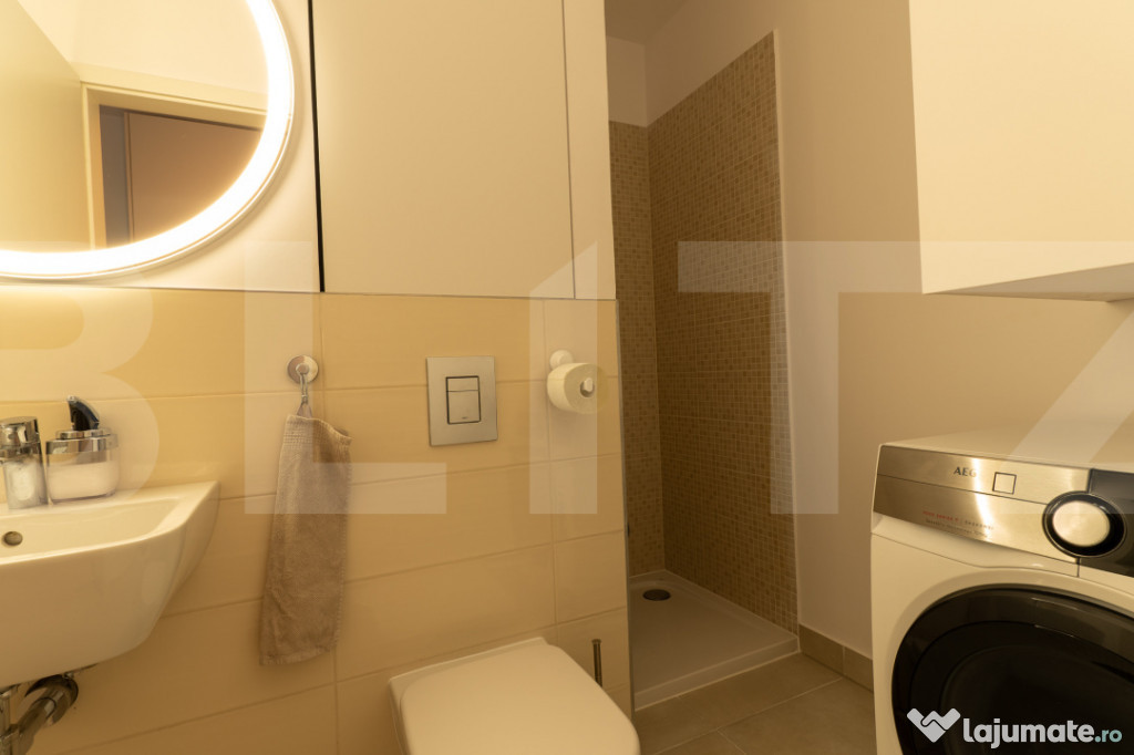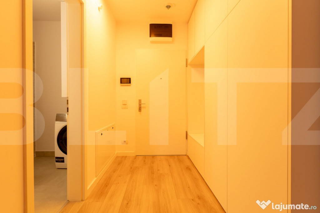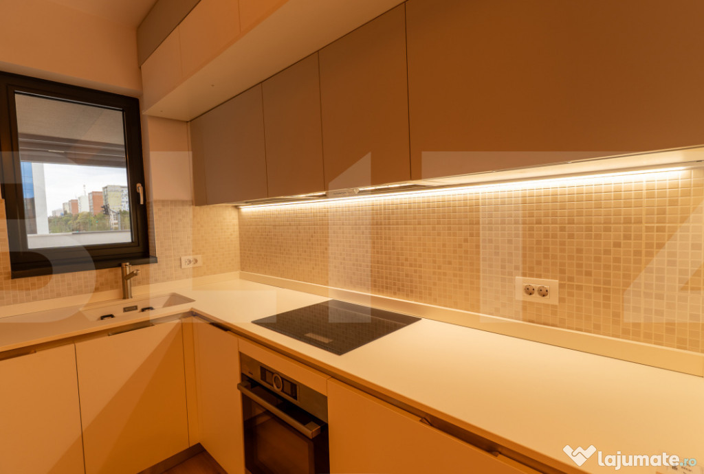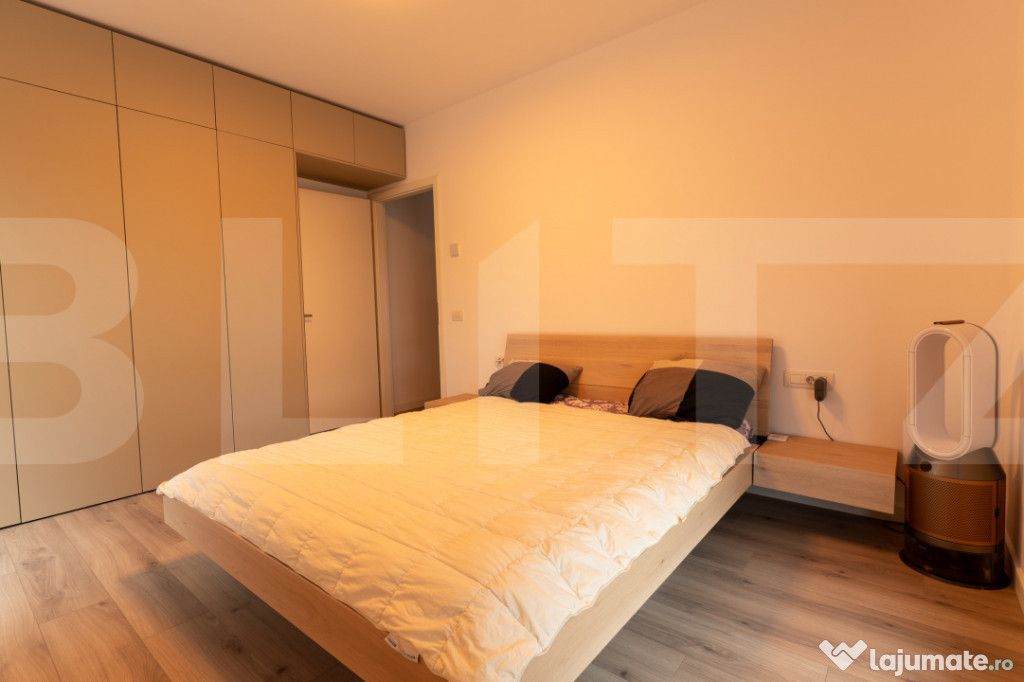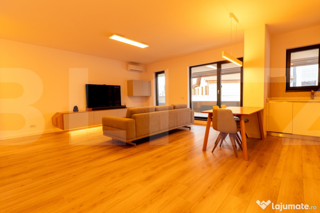 Apartament modern, complet mobilat și utilat, cu finisaje premium și tehnologie smart integrată: încălzire în pardoseală zonală, aer condiționat, rulouri și pergolă controlabile din aplicație.Bucătărie high-end (Bosch, Electrolux, Liebherr, Falmec), mobilă Veneta Cucine, blat ceramic, electrocasnice integrate. Living cu mobilier de calitate, canapea Natuzzi, TV Sony QD-OLED 65” + soundbar Dolby Atmos.