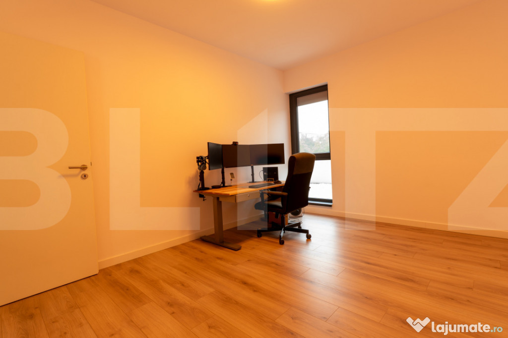 2 dormitoare izolate fonic, 2 băi complet echipate, birou electric reglabil, echipamente moderne: mașină spălat–uscat AEG, purificator Dyson, aspirator Roborock.