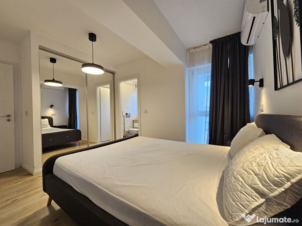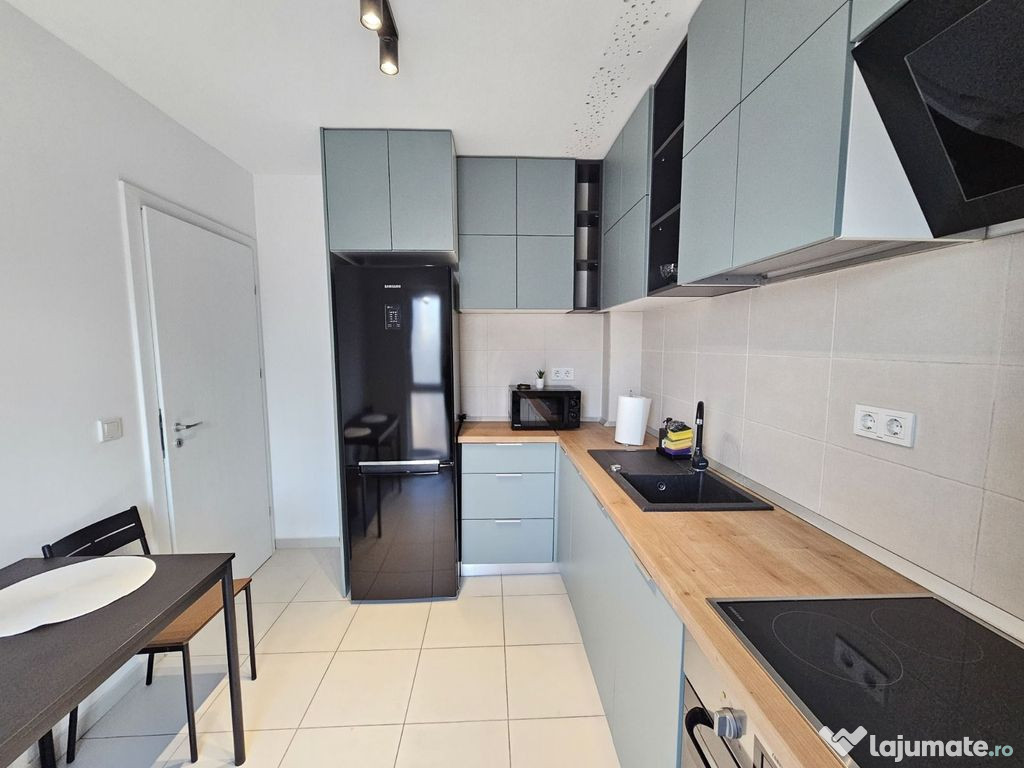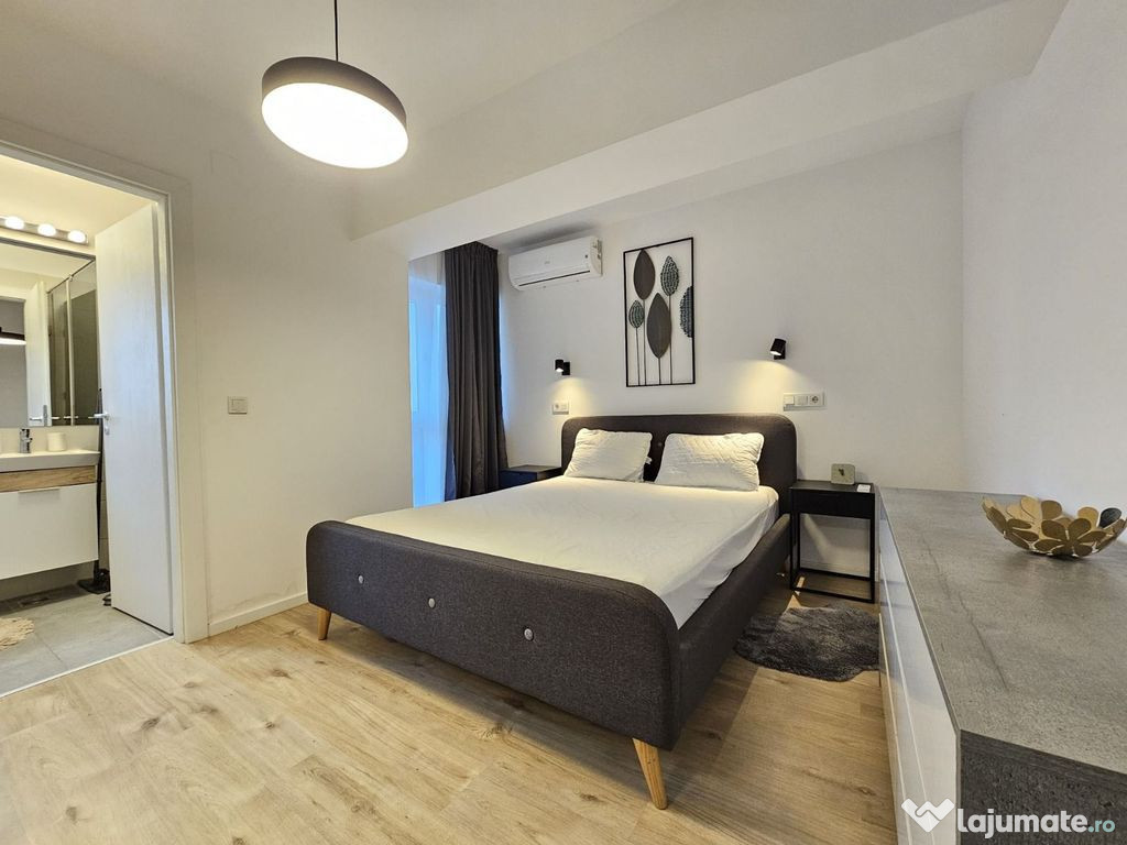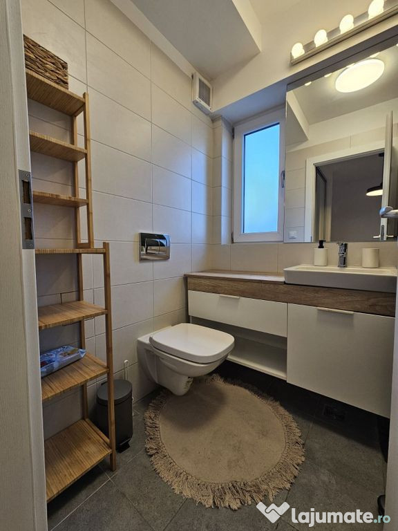 Apartamentul este complet utilat si echipat cu electronice si electrocasnice de ultima generatie: centrala individuala pe gaze, aparate de aer conditionat in ambele camere, Android Smart TV LED 4K Ultra HD Philips cu diagonal de 140cm si tehnologie Ambilight (lumini ambientale pe laterale), masina de spalat rufe, masina de spalat vase, plita electrica, cuptor, hota, cuptor cu microunde, chiuveta de granit, frigider Digital Inverter Samsung, aspirator, router wireless, etc.