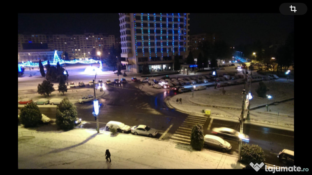 Vedere din fața blocului spre Hotel Trotuș, spre fosta stradă 11 iunie, spre fostul magazin Leonardo ( Cameră + Bucătărie )