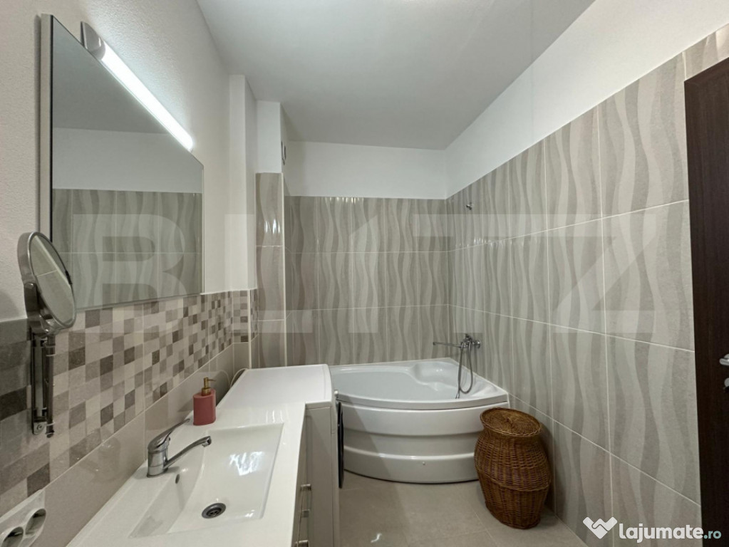 Baia este modernă și spațiosă, dotată cu o cadă de colț și finisaje de calitate, în nuanțe plăcute de crem și bej.