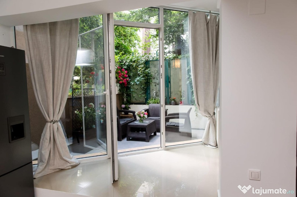Soseaua Nordului este de multa vreme o zona exclusivista, si asta nu numai pentru apropierea de cel mai mare parc bucurestean, Herastrau ci si pentru restaurantele fine, cafenelele renumite, vedetele tv ce locuiesc acolo, cele mai bune centre de sanatate, infrumusetare, etc. Sa nu uitam, insa si de apartamentele elegante, spatioase, frumos compartimentate, gandite anume pentru oamenii activi ai zilelor noastre.Apartamentul pe care vi-l propunem spre inchiriere, este elegant, mobilat (Mobexpert), utilat complet, si dispune de o terasa superba de 27mp. Blocul este tip boutique cu doar 4 familii. La doi pasi de Herastrau!