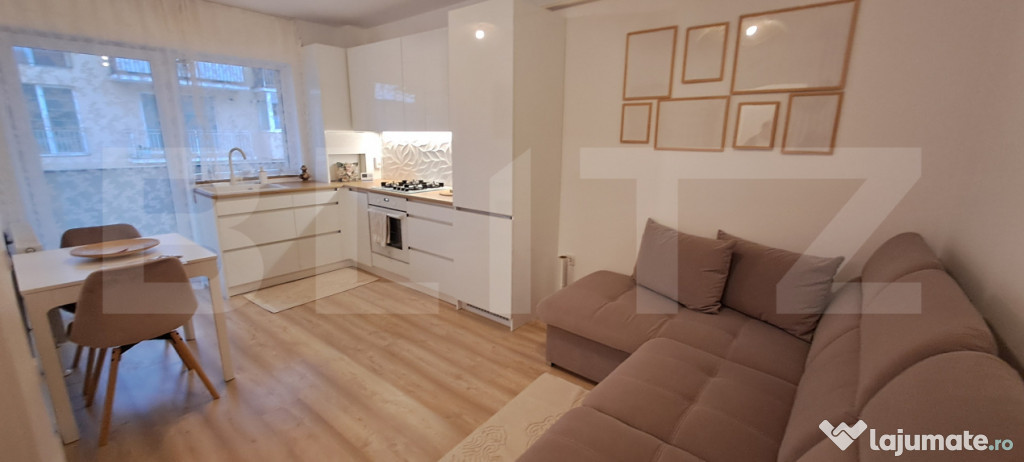 Blitz va ofera spre vanzare un apartament semidecomandat, cu 2 camere, mobilat si utllat premium, in zona strazii Porii, cu parcare exterioara inclusa in pret, intr-o zona linistita dar in acelasi timp aproape de toate punctele de interes din zona centrala: statii de transport in comun, supermarketuri, scoli ,gradinite,farmacii.Compartimentarea se prezinta astfel: living cu bucatarie open space cu iesire pe balcon, dormitor, la fel, cu iesire pe balcon, baie si balcon,