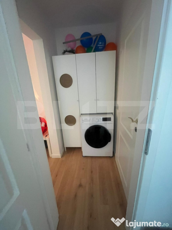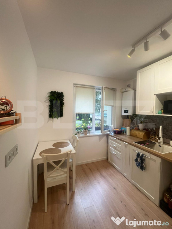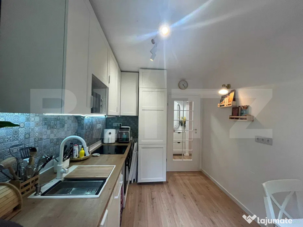 Bucătăria, amenajată cu mobilier IKEA și electrocasnice încorporate – cuptor, plită, frigider și hotă – oferă un spațiu modern și funcțional, completat de o masă extensibilă pentru șase persoane și toate instalațiile necesare pentru mașina de spălat vase. Baia a fost renovată integral, este dotată cu duș modern și are instalații pregătite pentru bideu.