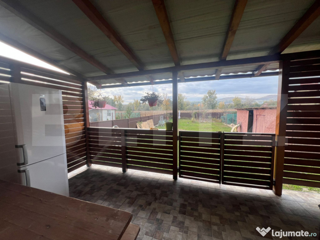 În plus, casa dispune de o terasă exterioară ideală pentru relaxare, iar în curte se află anexe utile pentru depozitarea uneltelor sau a altor materiale.