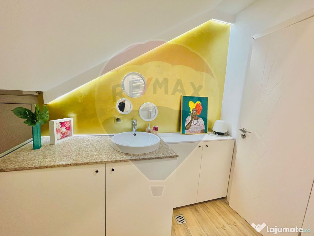 • Baie: cu geam, cabină duș, chiuvetă pe blat de granit, mobilier la comandă, mașină de spălat rufe integrată