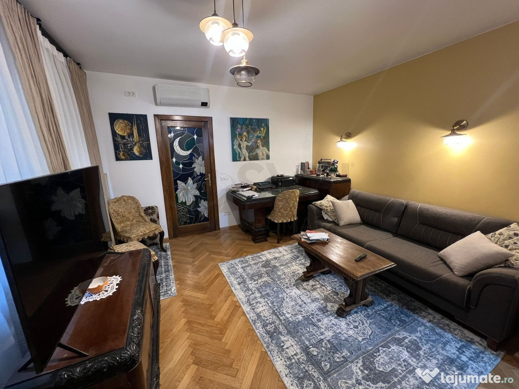 REA1025713 SVN Residentialist Pipera va propune spre vanzare apartament 2 camere in zona Dorobanti, Strada LondraVa prezentam spre vanzare un apartament cu 2 camere situat la etajul 3 intr-un imobil interbelic din renumitele Blocuri Resita, clasificat ca monument istoric si recunoscut pentru arhitectura, spiritul si eleganta epocii. Apartamentul are o suprafata utila de 50 mp completata de o boxa de 4,5 mp la demisol. Interiorul a fost restaurat si renovat in decembrie 2024, pastrand detaliile originale dar adaptat la confortul actual prin pardoseli si pereti placati cu travertin, parchet din lemn masiv montat in spic, usi originale cu vitralii restaurate, electrocasnice Samsung si mobilier premium combinat cu piese unicat. Instalatiile electrice, termice si sanitare au fost inlocuite integral, iar apartamentul dispune de centrala proprie, aer conditionat si loc de parcare in curtea blocului. Se vinde complet mobilat si utilat, inclusiv cu masina de spalat vase incorporabila Samsung.
