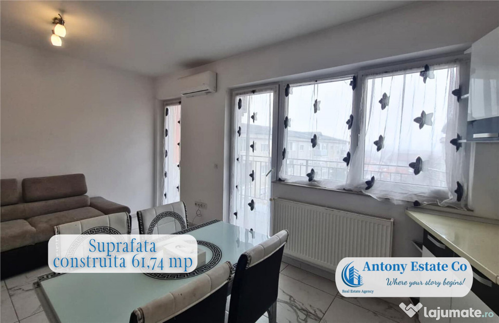 Detine o suprafata totala de 61,74 msup2; construiti, din care suprafata utila este de 44,28 msup2; 8,97 msup2; balcon.