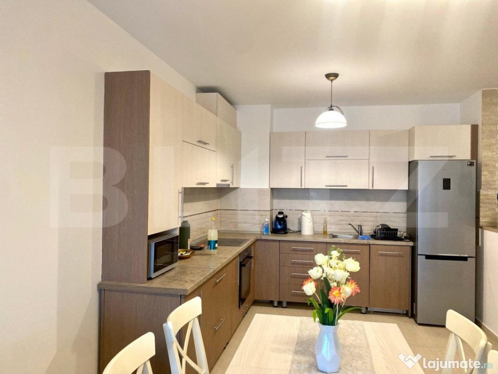 Livingul open space cu bucataria este gandit cu atentie, oferind zone armonizate cromatic si cu o functionalitate ridicata. Bucataria va pune la dispozitie un spatiu generos de lucru, aceasta este utilata cu frigider, cuptor, plita dispusa cu hota si cuptor cu microunde. Bucataria este delimitata ingenios de zona de living cu un perete din mobilier inalt ce poate fi folosit oricand precum un mini bar.