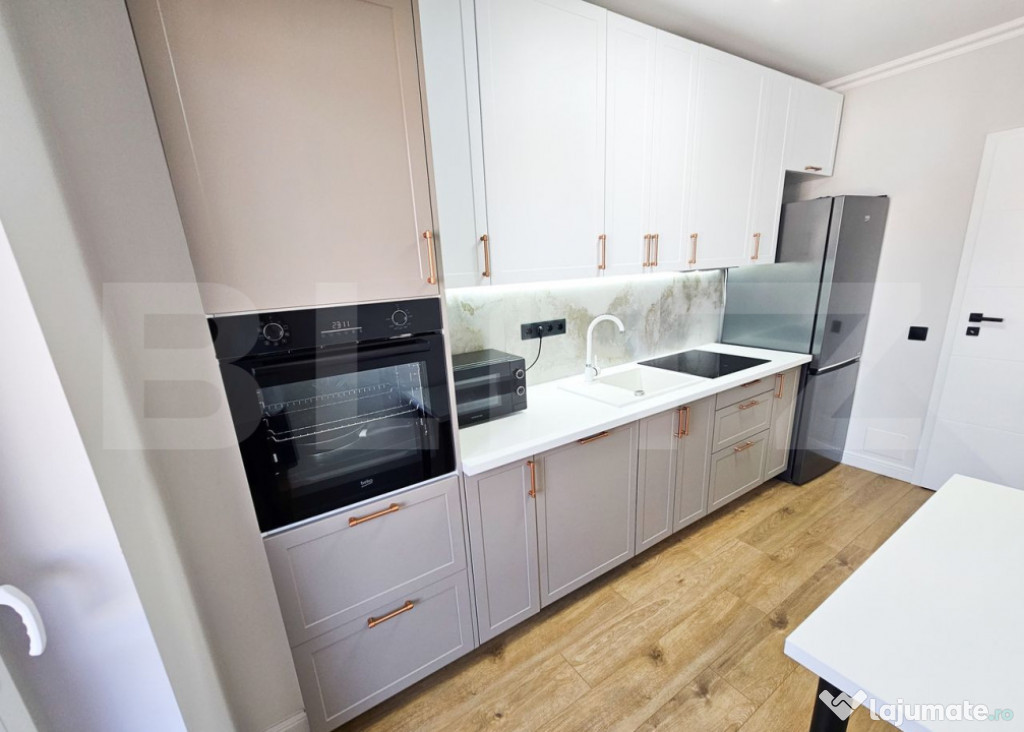 Compartimentare ideală: living generos, bucătărie, dormitor elegant, baie modernă, spații perfect optimizate
