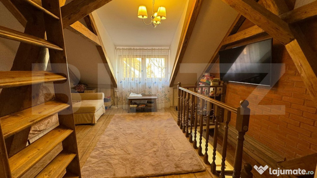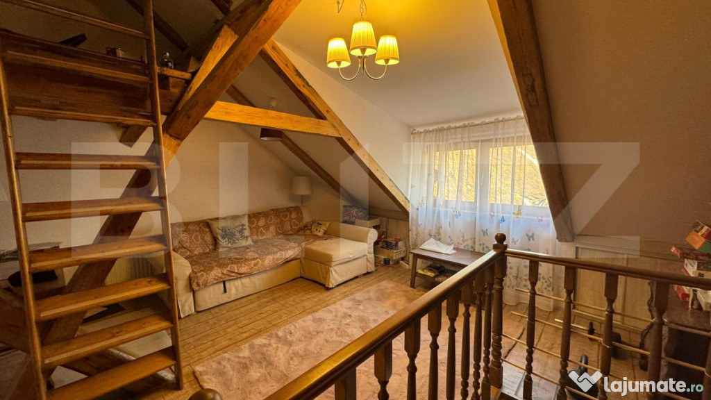 BLITZ Brasov va prezintă oportunitatea de a va muta intr-un apartament deosebit, complet renovat, cu 4 camere, situat într-o casă pe două niveluri, amplasată strategic la doar câțiva pași de Centrul Istoric al Brașovului.Ca structura si compartimentare, vorbim de un apartament cu 4 camere, 3 bai, bucatarie deschisa, dressing, un balcon si o terasa, desfasurat pe o suprafata utila de 150 mp.
