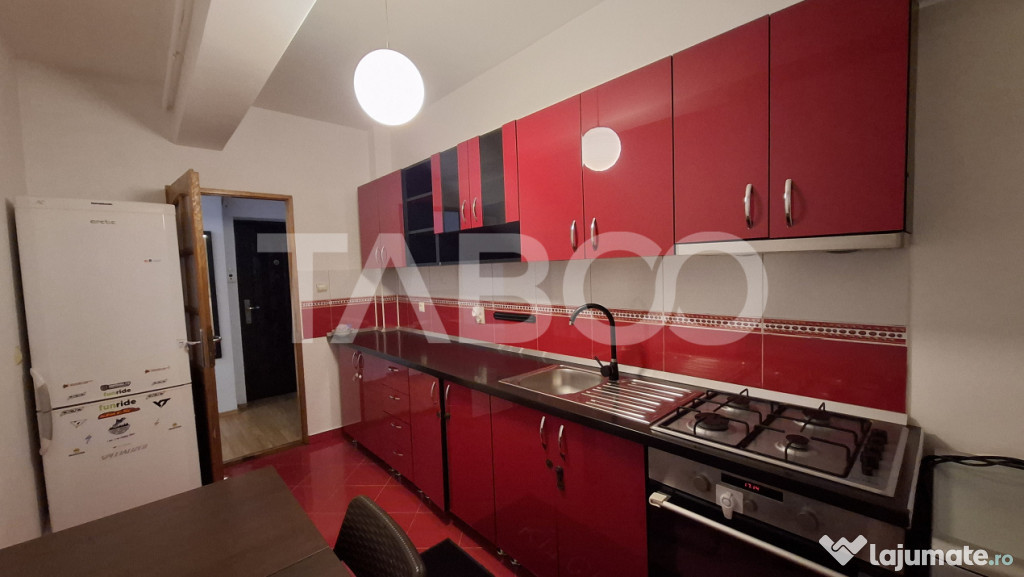Apartamentul se vinde mobilat si utilat cu: plita pe gaz, cuptor, hota, masina de spalat vase, frigider cu congelator,