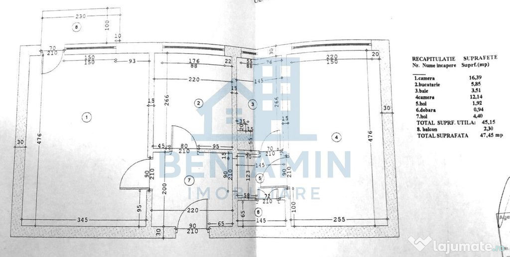Cu o suprafață totală de 47,45 mp și utilă de 45,15 mp, locuința dispune de un balcon izolat, amplasat pe living.