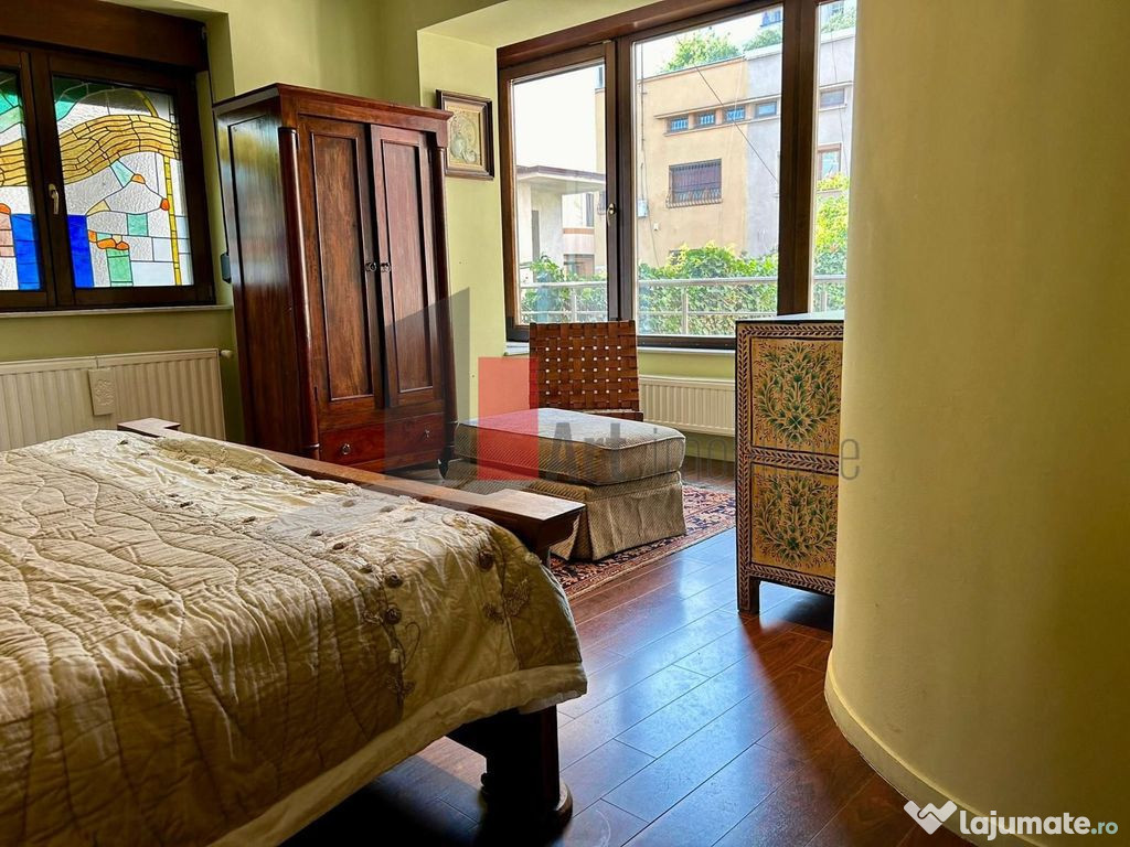 Duplexul are 4 camere, dintre care 2 dormitoare, 3 băi (două cu cadă/duș și una de serviciu), living generos cu șemineu, bucătărie deschisă cu zonă de dining, camări și dressinguri, plus o terasă specială cu statuie în mijloc. Proprietatea este complet mobilată și utilată cu gust și finete, pregătită pentru a deveni acasă imediat.
