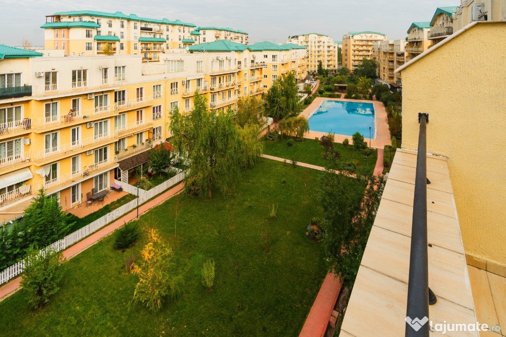 Are o suprafata de 91 mp, orientare Sud-Vest. Se vinde partial mobilat, exact asa cum putem vedea in fotografii. Este pozitionat la etajul 5, oferind o priveliste superba spre piscina si spatiul verde.