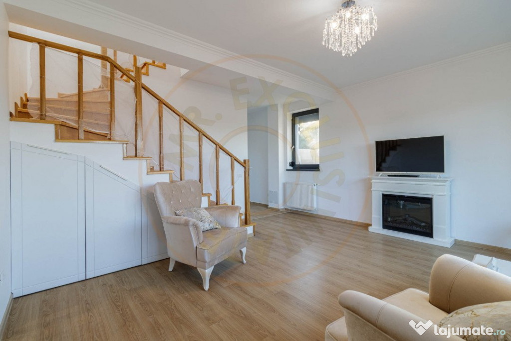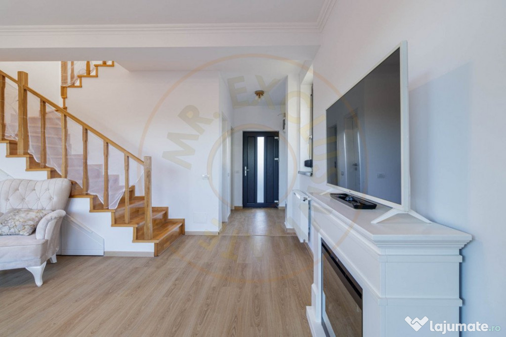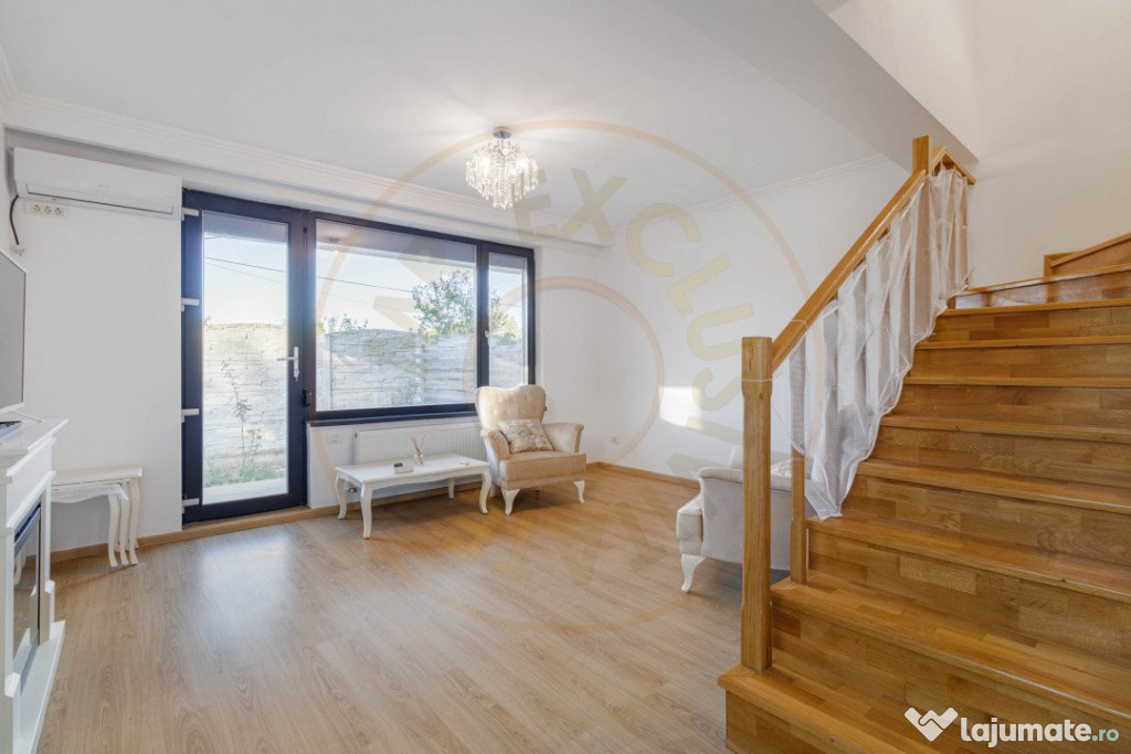 Living luminos, cu acces direct spre curte, spațiu de depozitare sub scări, aer condiționat și TV