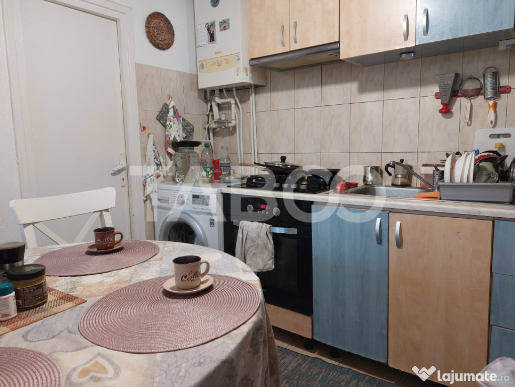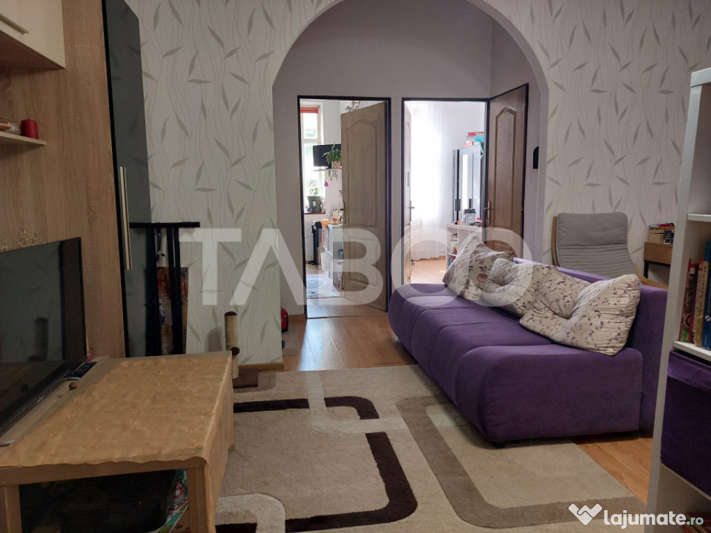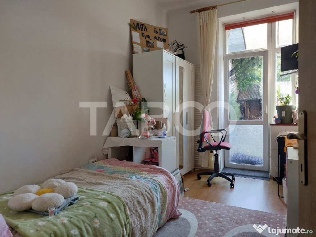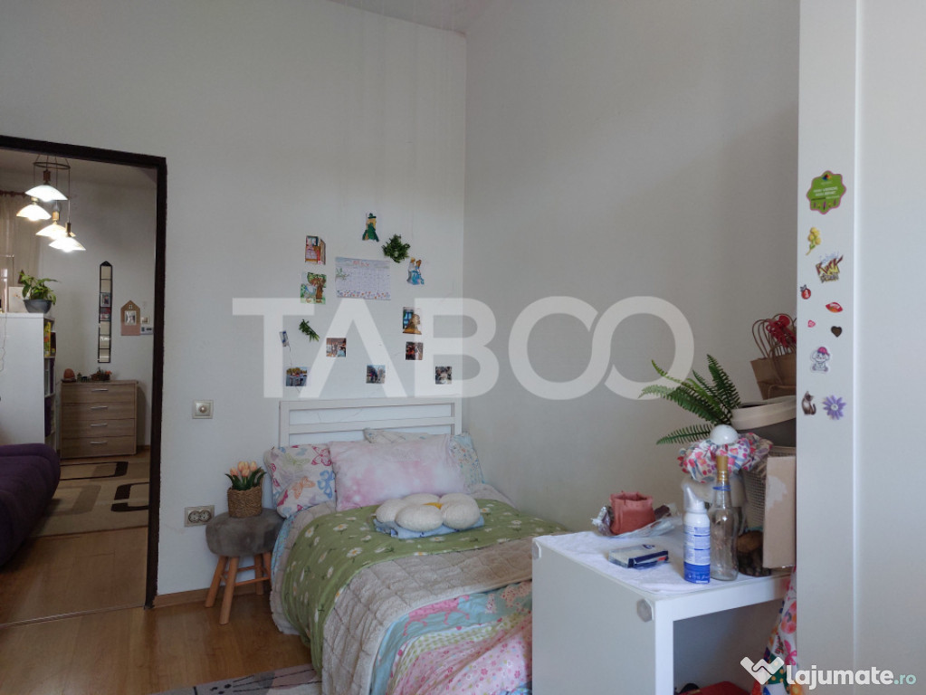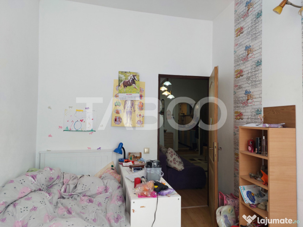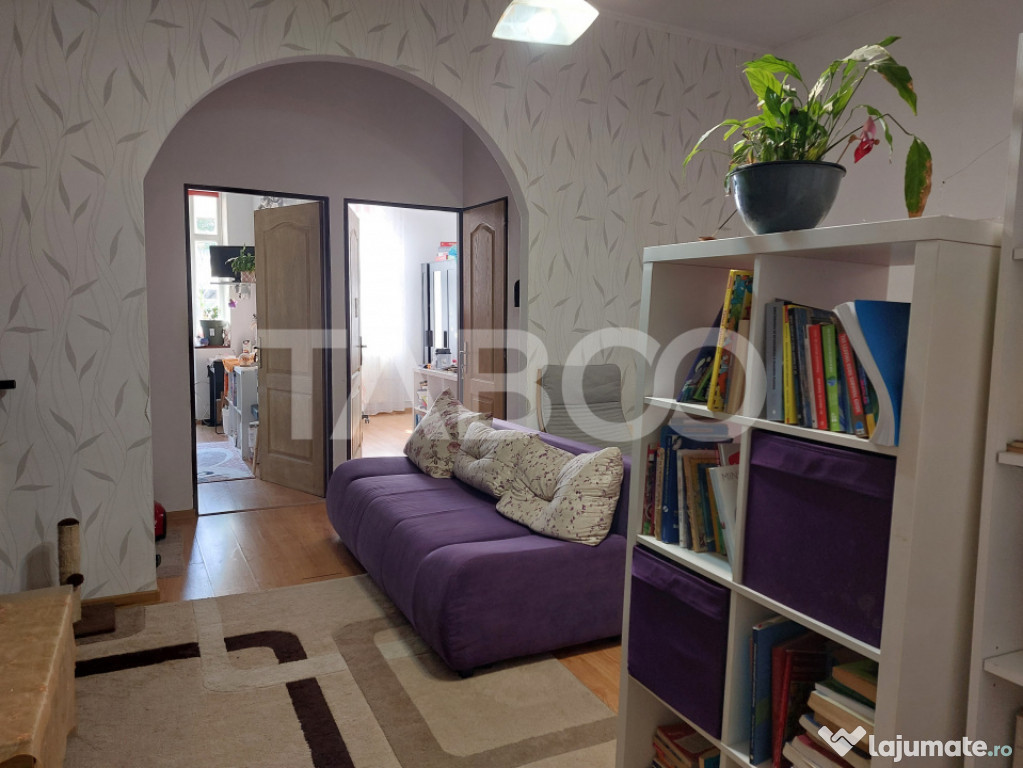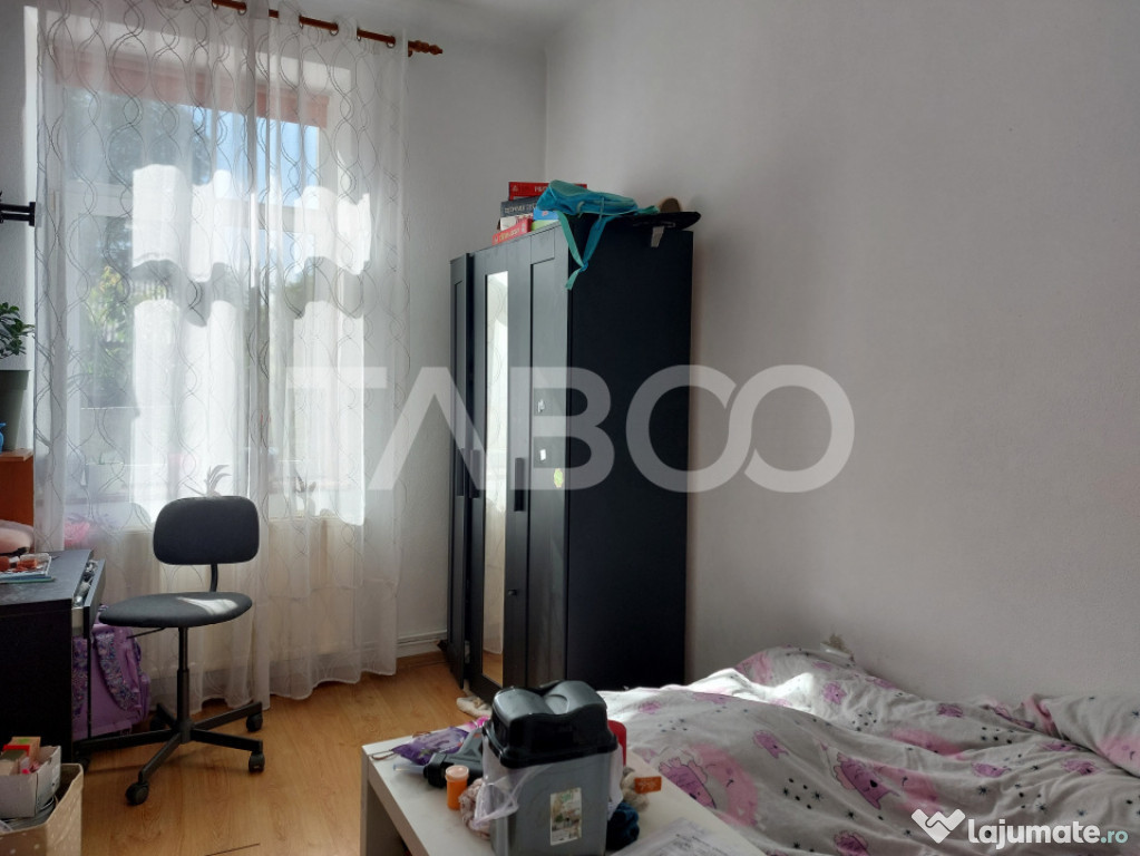 Apartament 3 camere de vanzare, semidecomandat, 59 mp, Cisnadie.Apartament de vanzare la curte cu gradina cu acces direct din casa. Aparatmentul are 2 dormitoare mai micute pretabile pentru copii, zona de living care este separata de un dormitor pentru parinti. Apartamentul, pe langa gradina proprie are si o terasa care poate fi fie zona de relaxare fie zona de biciclete si depozitare.