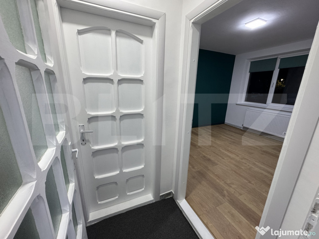 Blitz va propune spre închiriere un apartament de 2 camere semidecomandat, situat la parter, cu o suprafață utilă de 50 mp, compartimentat inteligent, fiecare cameră beneficiind de propriul hol de acces.Imobilul este construit din cărămidă și izolat termic, ceea ce îl face deosebit de eficient energetic — călduros iarna și plăcut răcoros vara. Alături de centrala termică proprie pe gaz, costurile de întreținere sunt extrem de reduse. Apartamentul este amplasat în cartierul Brazda lui Novac, în imediata apropiere a Hotelului Rocca, într-o zonă ușor accesibilă și potrivită pentru multiple tipuri de activități profesionale. Datorită amplasării și compartimentării sale, spațiul se pretează excelent pentru birouri, cabinet de psihologie, asigurări, notar sau alte activități similare.