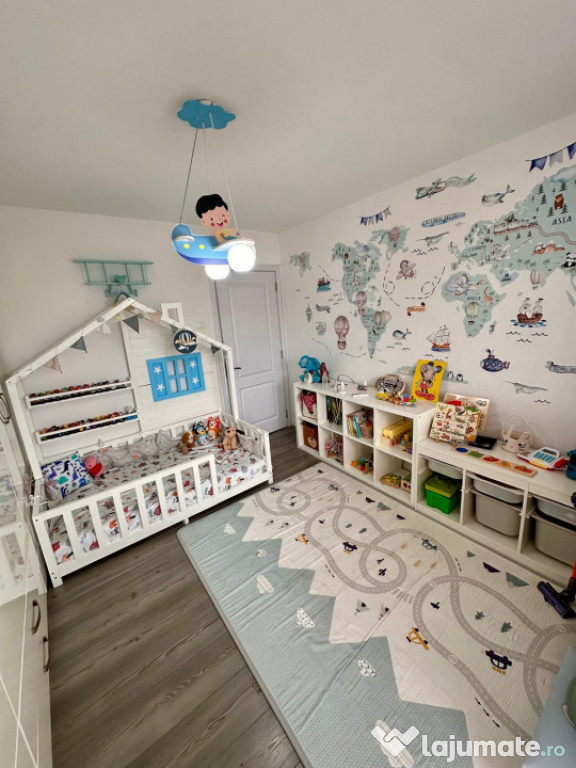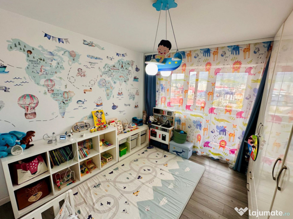 Gândită pentru confort și siguranță, oferă un spațiu prietenos și bine organizat, cu dulap pe tot peretele (tip dressing), mobilier special pentru copii și acces direct la balcon — ideal pentru lumină naturală și aer proaspăt.