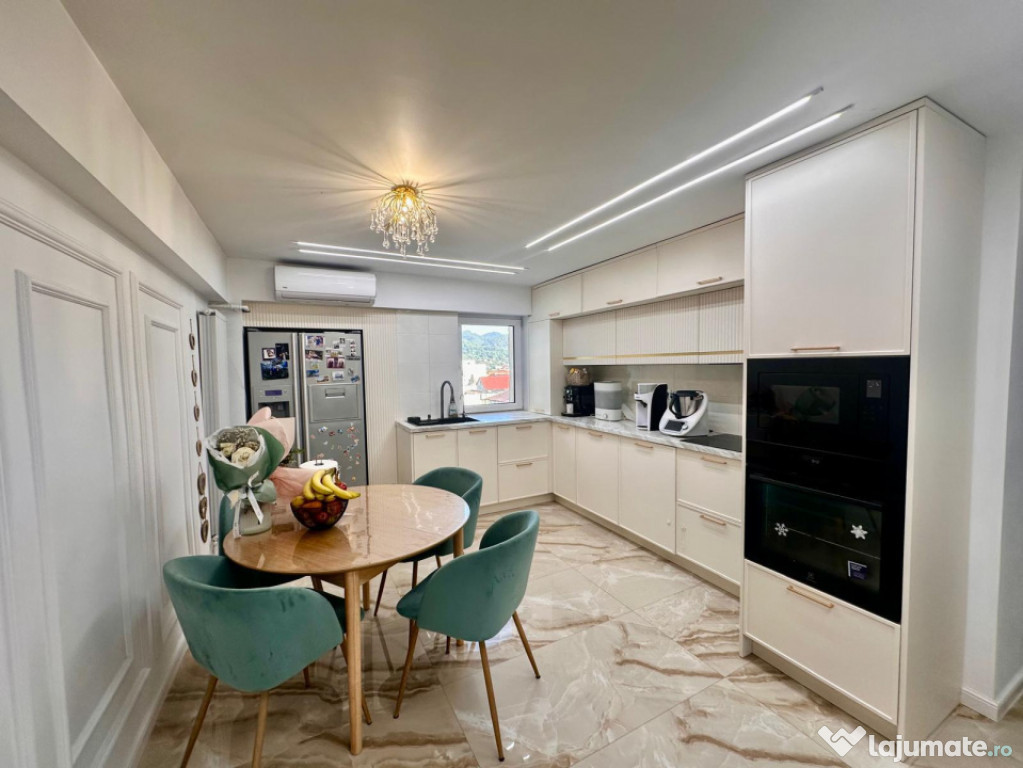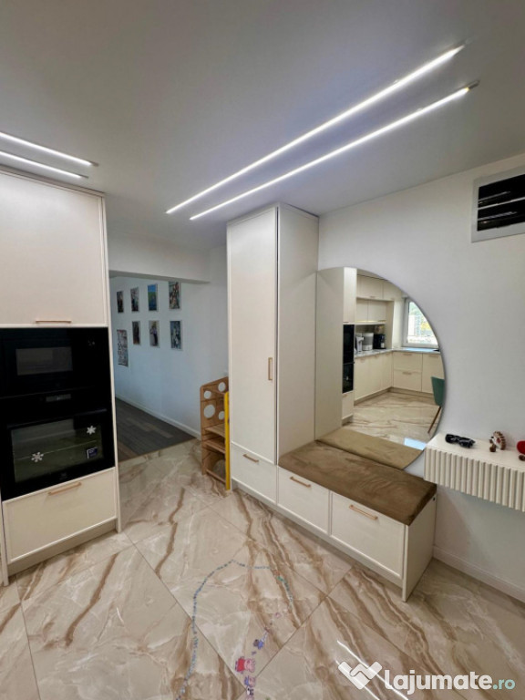 Complet renovată în 2024, îmbină designul modern cu funcționalitatea inteligentă. Este dotată cu mobilier elegant, executat la comandă, și electrocasnice de lux — toate în garanție. Instalația electrică a fost refăcută integral, iar finisajele premium (gresie și faianță noi) oferă un aspect sofisticat.