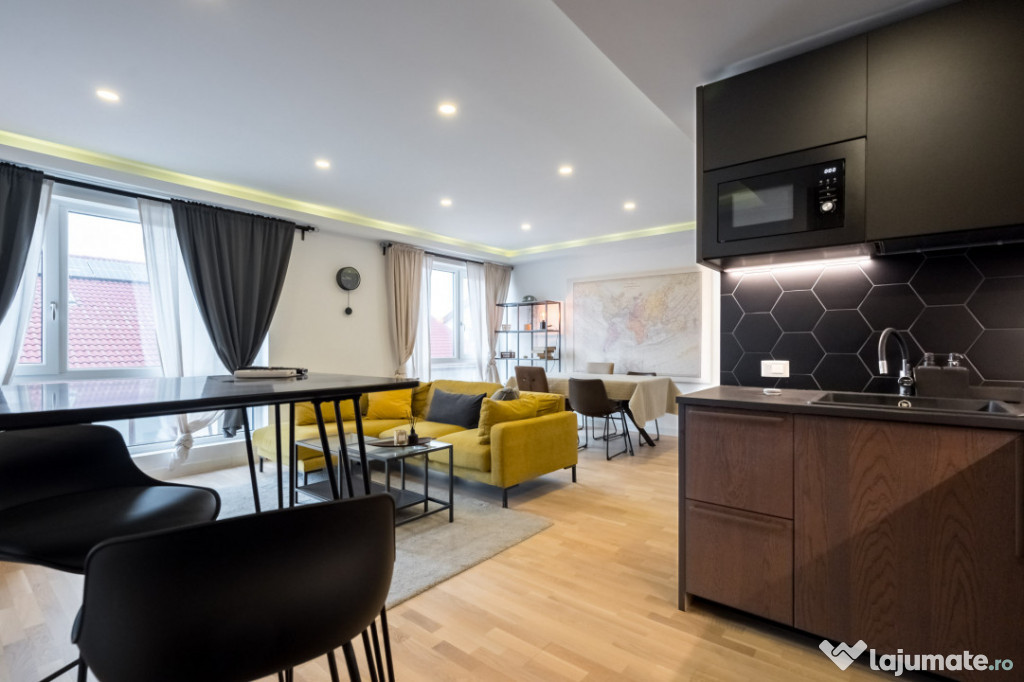 Bucătăria, integrată în living, este dotată cu electrocasnice moderne de înaltă calitate și mobilier funcțional, care optimizează fiecare centimetru de spațiu disponibil. Blatul mat conferă un aer luxos, iar plita și cuptorul electrice incorporate fac pregătirea meselor o experiență plăcută și eficientă. Un bar cu scaune înalte oferă un loc convenabil pentru micul dejun sau pentru servirea unor gustări rapide. Dotari apartament: cuptor cu microunde, masina de spalat, fierbator de apa, prajitor de paine, aer conditionat(cate unul in fiecare camera).