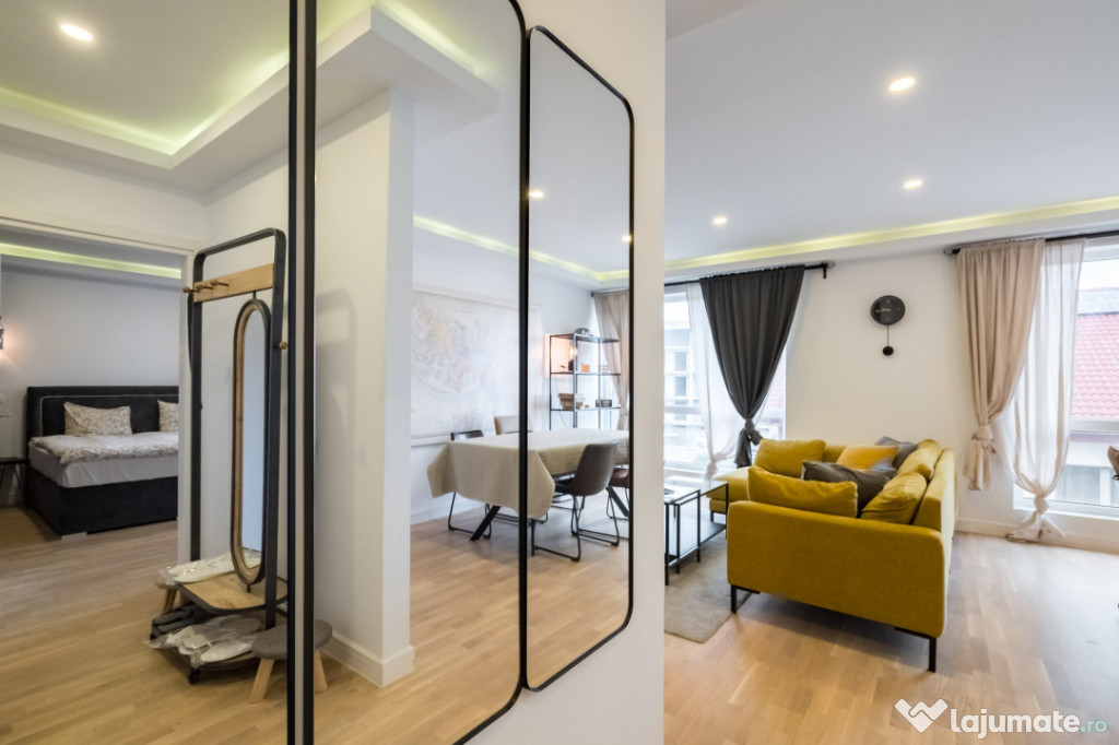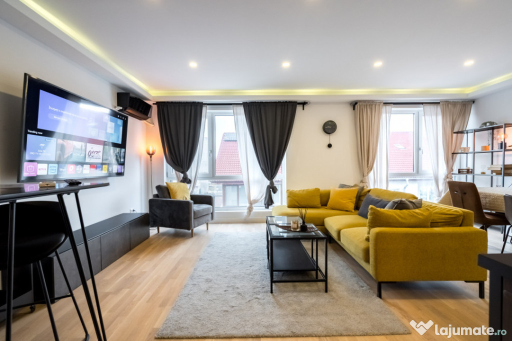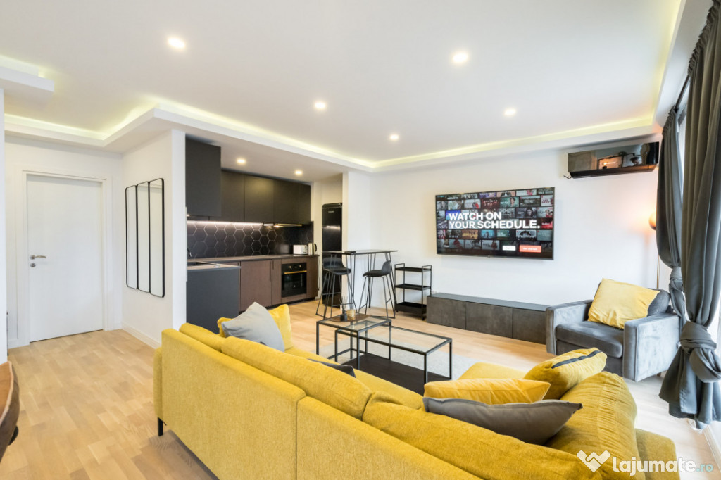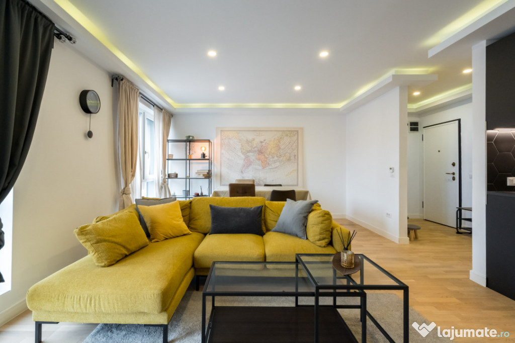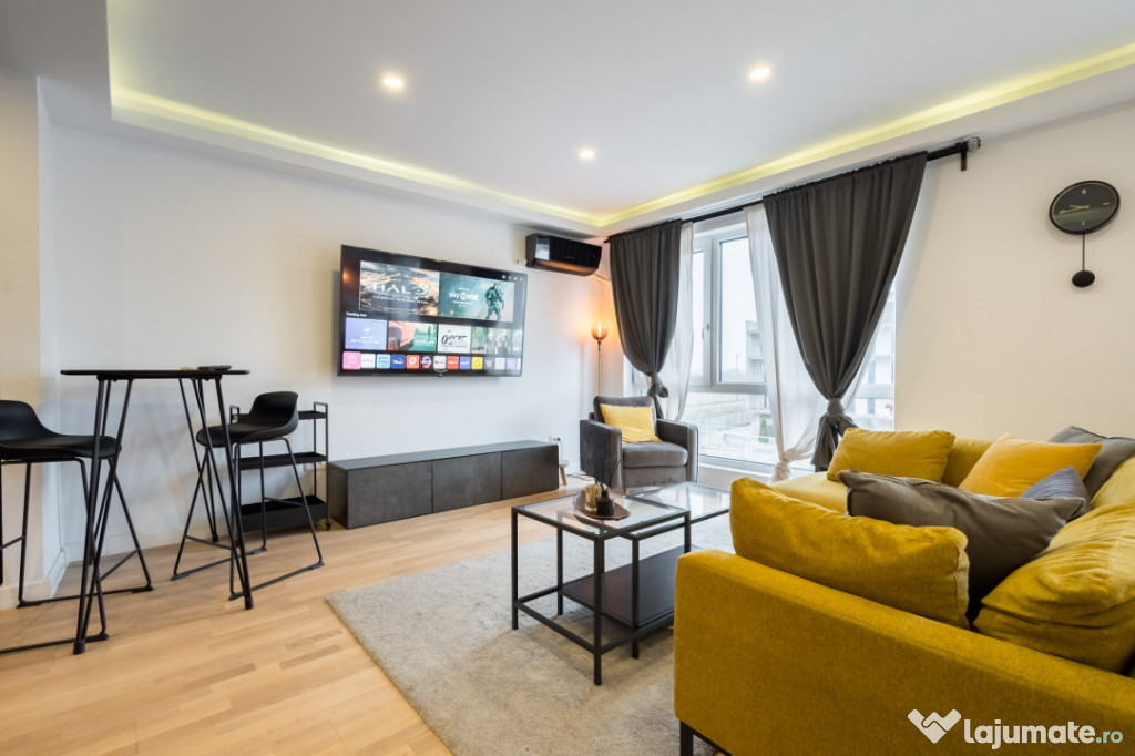 Te întâmpină o atmosferă rafinată încă de la intrare în acest apartament de două camere, situat într-un bloc rezidențial elegant din zona de prestigiu Pipera. Imediat ce pășești în hol, ești întâmpinat de o atmosferă caldă și primitoare, datorită iluminatului ambiental subtil și a paletelor de culori delicate, atent selectate de către designerul interior.Living-ul este spațios și luminos, decorat cu mobilier modern și confortabil, care adaugă o notă de eleganță în fiecare colț. O canapea generoasă, tapițată cu un material textil moale , aducând un strop de personalitate în încăpere. Alături, o masă de cafea ,completează zona de relaxare, oferind un spațiu perfect pentru conversații relaxante sau pentru a savura o ceașcă de cafea în liniște.