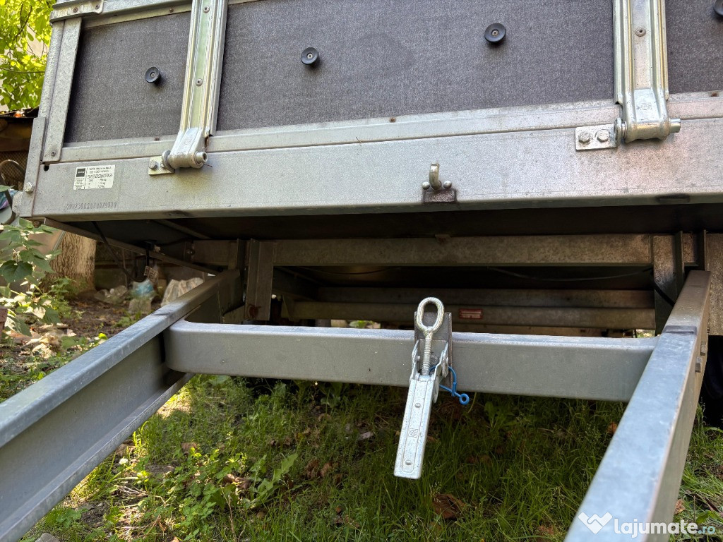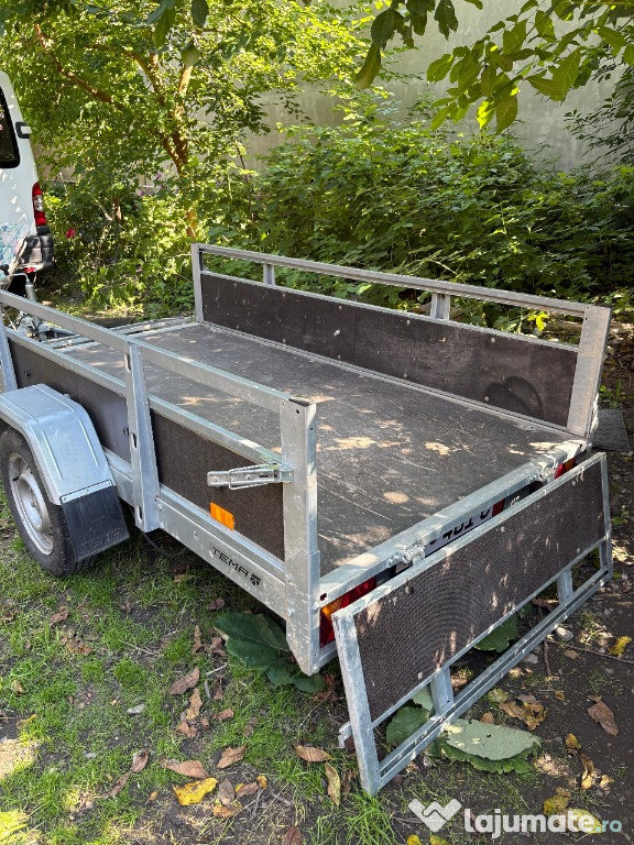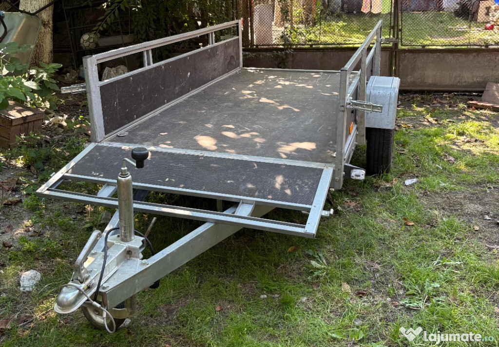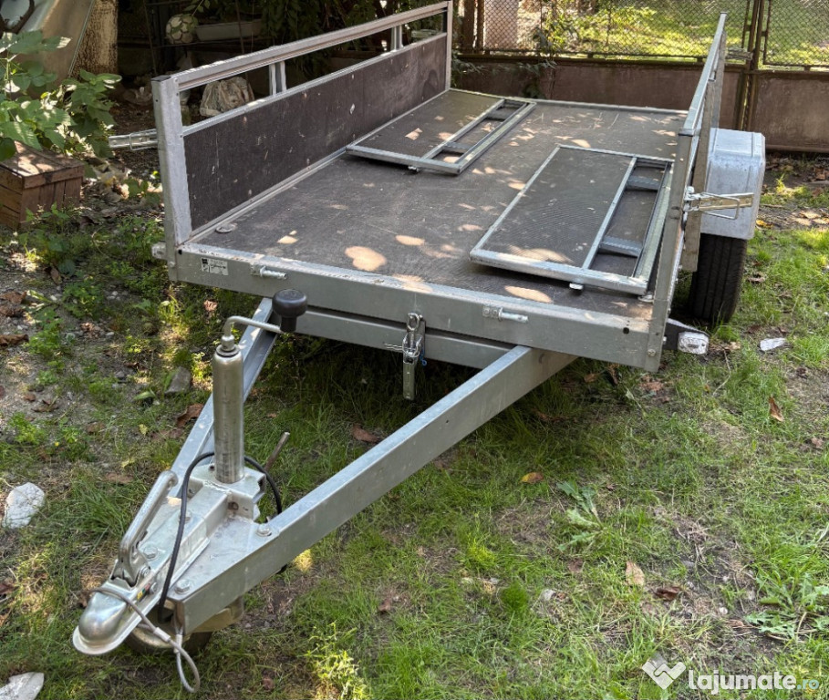 Remorcă auto basculabilă, stare foarte bunăVând remorcă auto robustă, cadru galvanizat, platformă cu obloane rabatabile față, spate– ideală pentru transport marfă, materiale de construcții sau unelte.