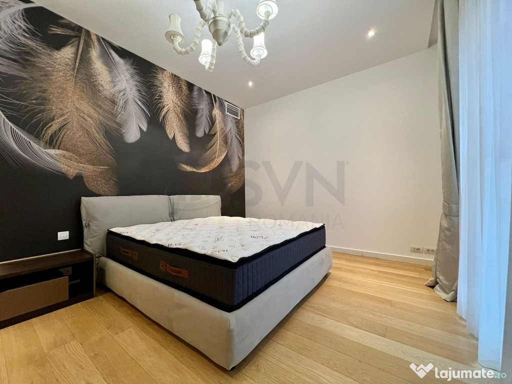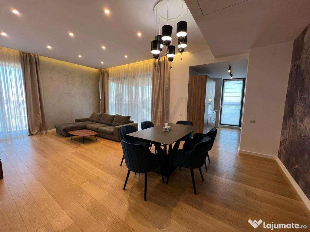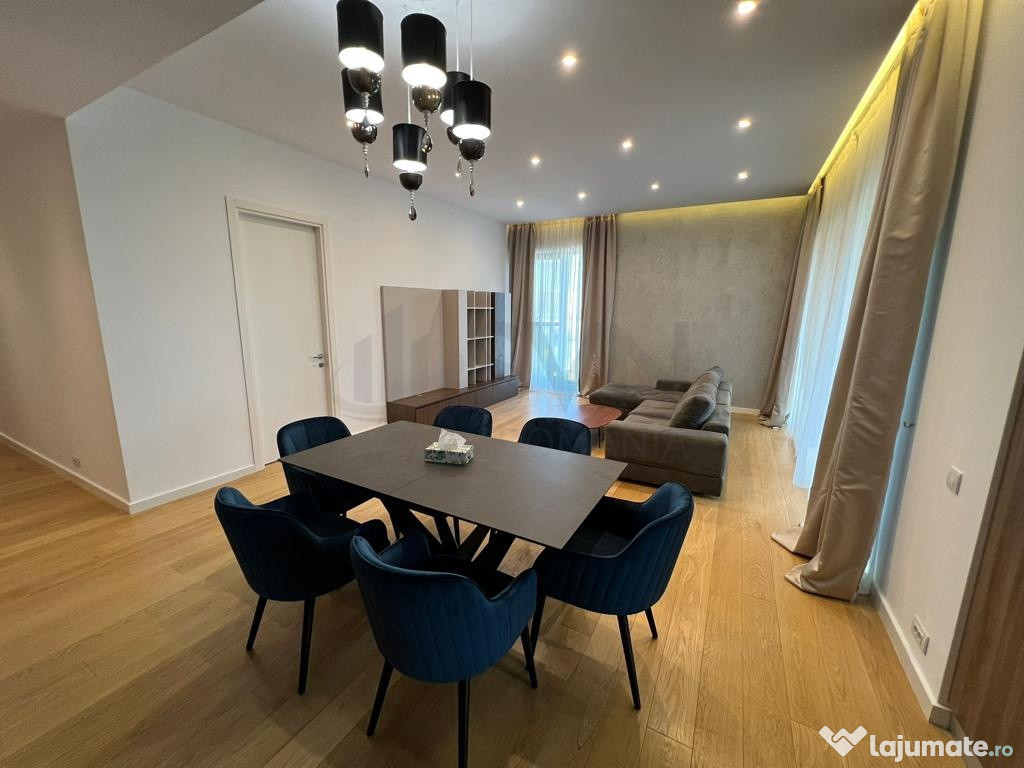 Apartamentul este complet mobilat si utilat, amenajat cu finisaje premium si un design modern si elegant. Bucataria open-space este complet echipata, iar cele 3 bai si spatiile de depozitare atent gandite asigura confortul deplin al locuirii.
