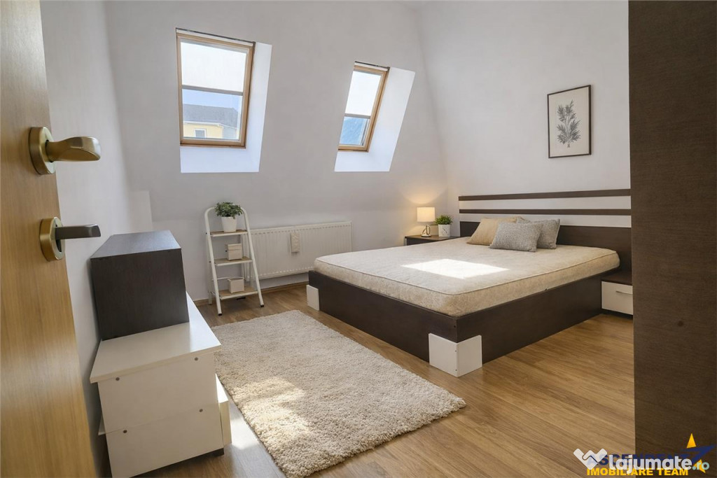 propune spre inchiriere un apartament deosebit, tip penthouse, pe doua niveluri, cu scara interioara, situat la etajul 4 plus mansarda, cu scara interioara.