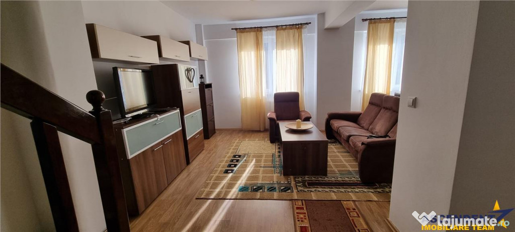 Se inchiriaza mobilat si utilat, fiind dotat si echipat cu tot ce este necesar precum : masina de spalat haine , cuptor electric, plita gaz, centrala proprie, dispune de vesela in bucatarie, aspirator, fier de calcat, masa de calcat, tv - living, etc.