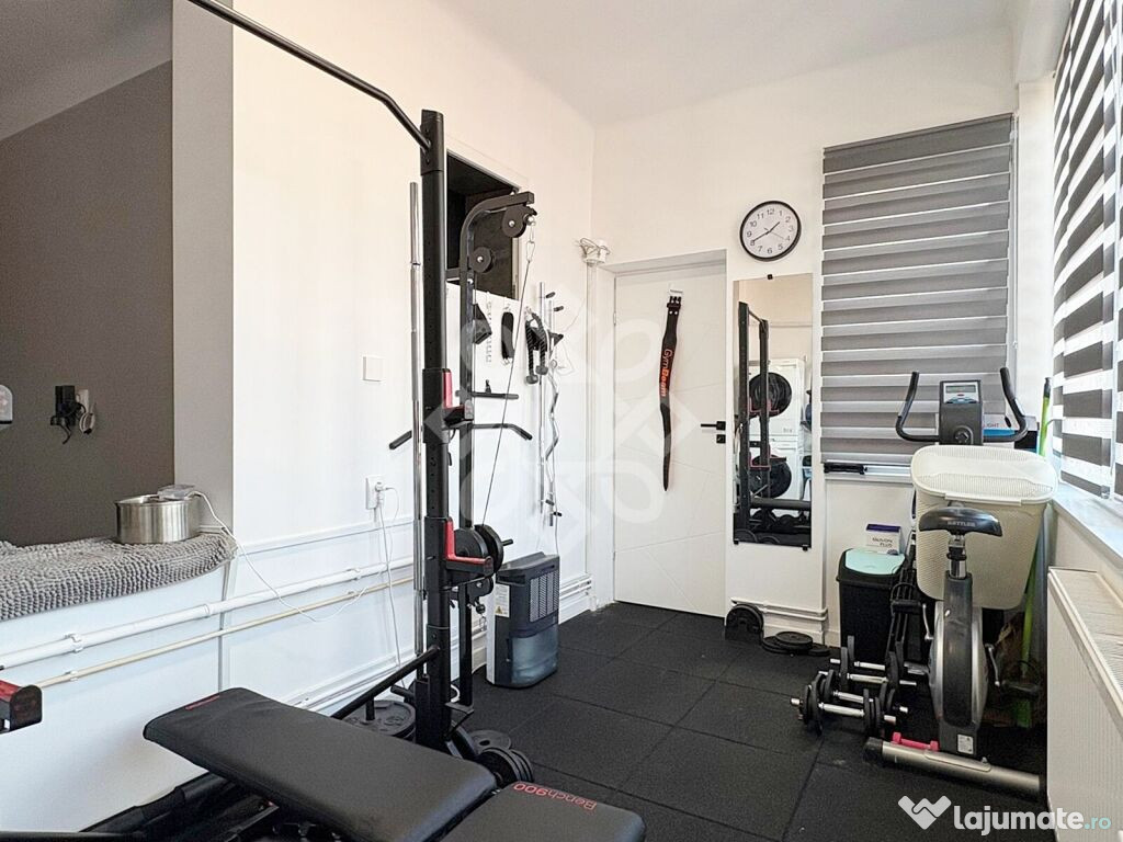 Este decomandat, compus din hol de acces generos, bucatarie moderna cu loc de luat masa, 2 dormitoare, baie cu dus, living cu acces la un mic balcon cochet orientat spre strada. Balconul inchis de 10 mp gazduieste o adevarata sala de sport, dotata cu diferite aparate de antrenament.
