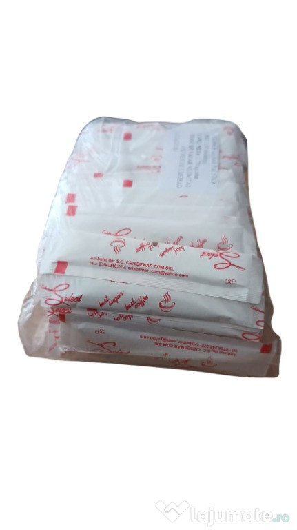 Zahăr alb ambalat individual în pliculețe de unică folosință, ușor de folosit 0,5g – soluția practică în orice context: cafenele, restaurante, hoteluri, birouri sau acasă.Două variante disponibile: