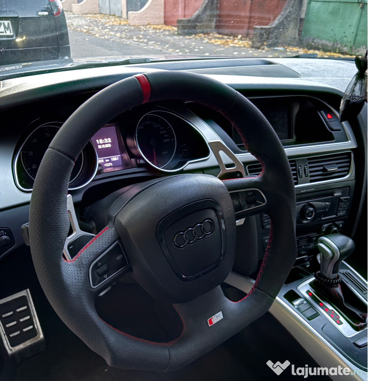 -volan custom piele normala sus jos , piele perforata laterar plus cusatura rosie , emblemele audi negre pe volan plus padele