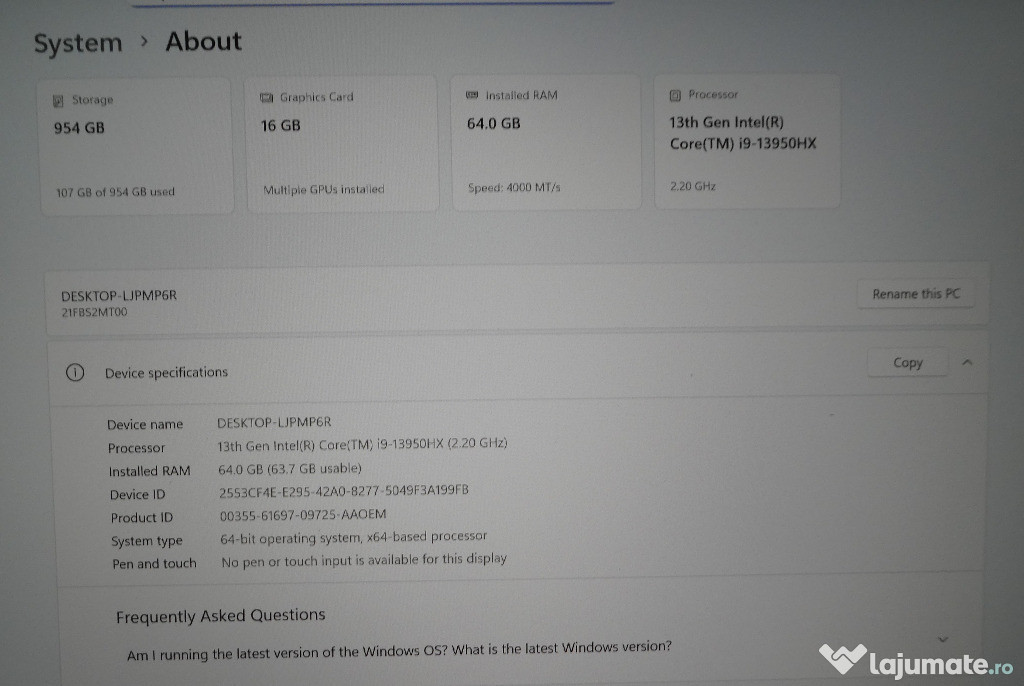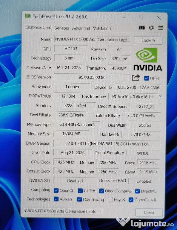 Anuntul Laptop workstation Lenovo P16 Gen 2 ,i9 13950hx,RTX 5000 ada,64gb, este adaugat de pe LaJumate.ro.