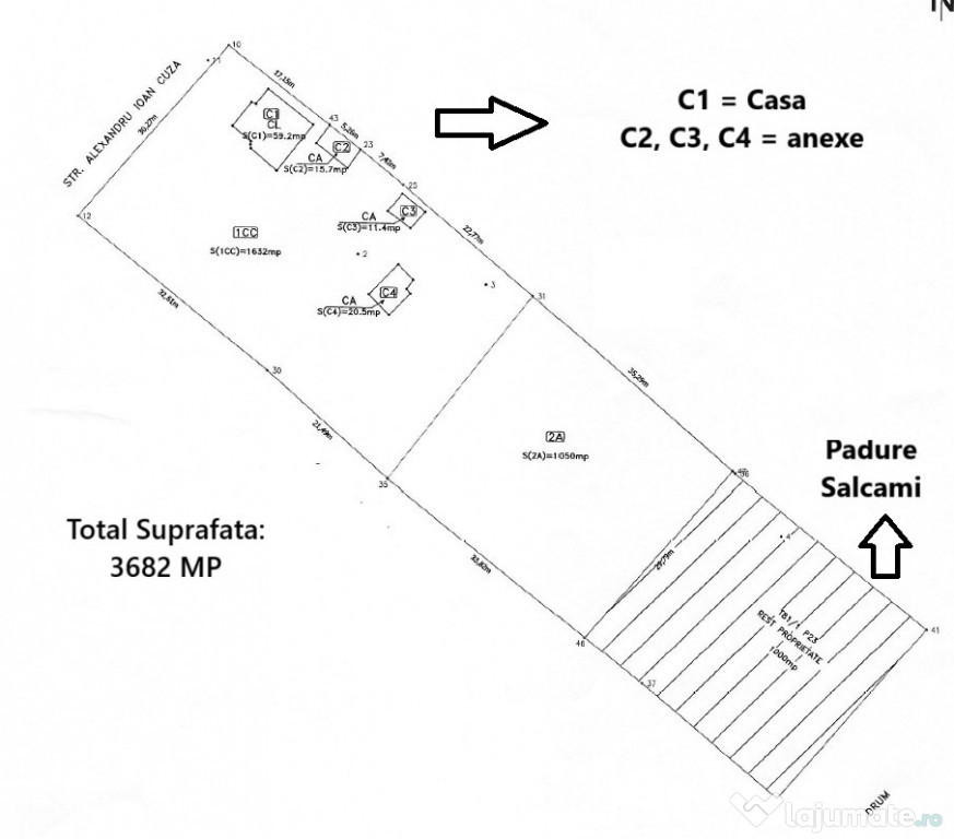 Suprafață teren: 3.682 mp (din care 1.000 mp pădure de salcâm)