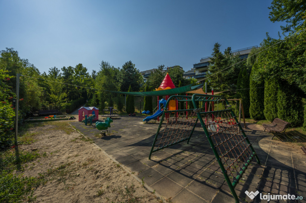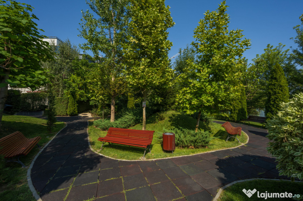 Accesul in complex este securizat si beneficiaza de paza 24/24 si monitorizare video. Complexul beneficiaza de foarte multe facilitati: acces securizat cu bariera, spatii verzi, parc, loc de joaca pentru copii, piscina in incinta complexului, zone de agrement si socializare, zona de joaca pentru adolescenti ( poarta de fotbal si cos de baschet). Toate imobilele au spatii verzi iar parcul si zona de promenada de langa lac sunt amenajate peisagistic cu mula vegetatie, plante, copaci, gazon, alei si bancute. Imobilul are 2 lifturi si acces securizat.