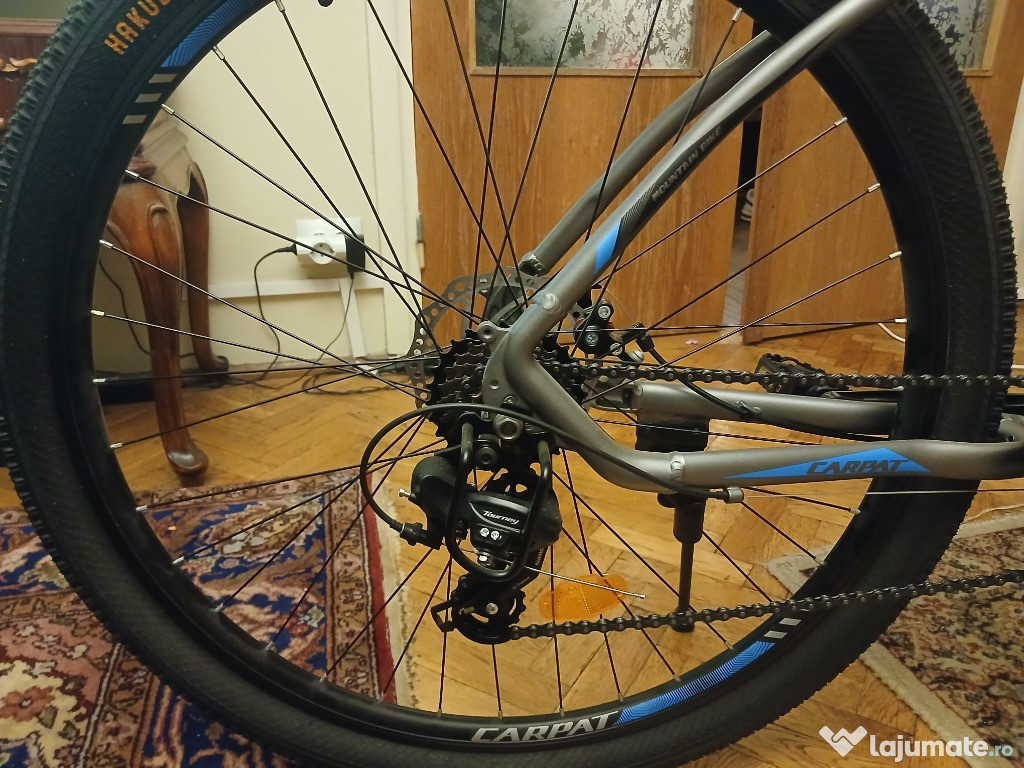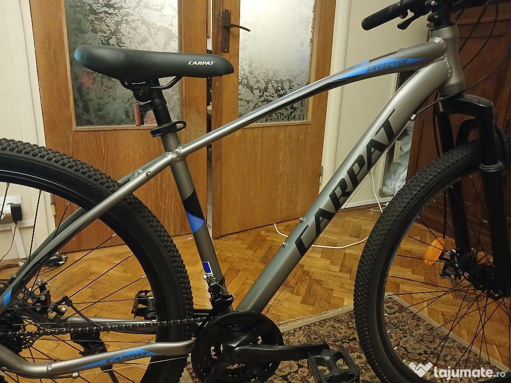 Bicicleta a fost tinuta pe balcon de când a fost cumpărată. Este nefolosita pentru ca nu a avut nimeni timp de ea. Arata impecabil.Roti 29 inch, schimbător de viteze Shimano Tourney TZ secvențiale ST-EF41-2A cu indicator de viteza, 21 de viteze și manete frână integrate (7 trepte, cu protectie la lovituri), Cadru produs din aluminiu 6061 (special pentru biciclete cu geometrie specifica MTB-HT, vopsit în câmp electrostatic, mărime cadru 451mm) sistem de franare mecanic cu disc diametru 160mm (Alhonga MD15), furca echipata cu suspensie pe arc (cursa 100mm, utilizata pentru teren accidentat), Jante Carpat (material aluminiu, perete dublu, sistem de blocare rapida), greutate bicicleta 15.3 kg, sarcina maxima suportata 130kg, înălțime utilizator 170-195cm.