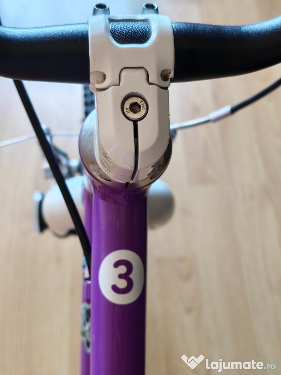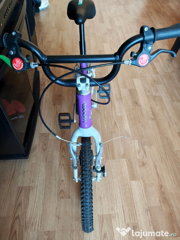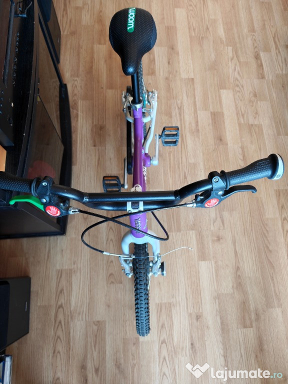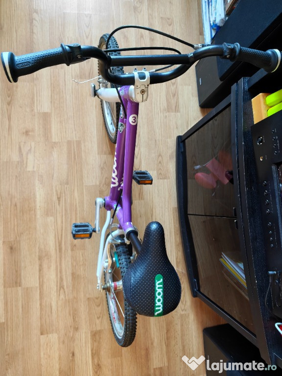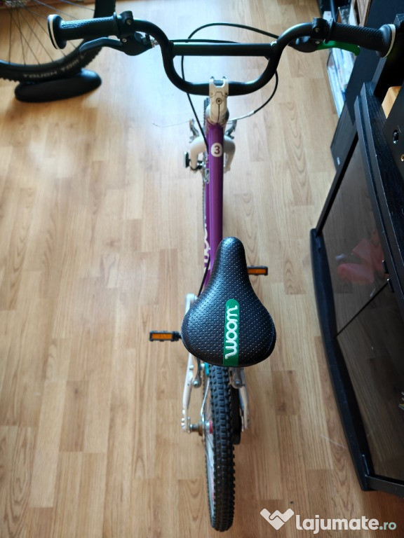 Vând bicicletă WOOM 3, mov, pentru copii de 4–6 ani (înălțime 105–120 cm). Extrem de ușoară (5,4 kg), cu cadru din aluminiu, protecție pentru lanț, limitator de ghidon și anvelope cu rulare ușoară.Stare foarte bună de functionare.