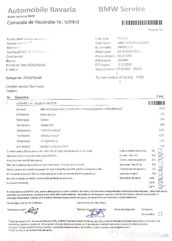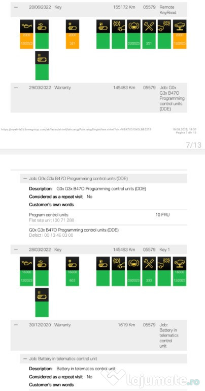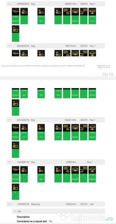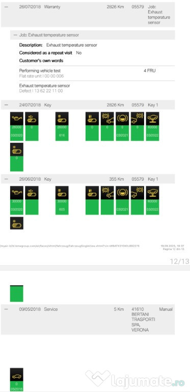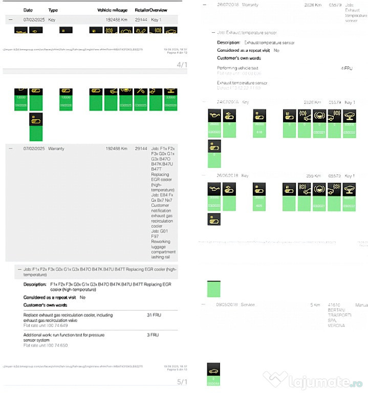 Afișaz: 200.000 de km-Mașina a fost achiziționată în anul 2024 din țara de origine- Italia.Primul proprietar din Italia a fost o firmã care a expus-o la vânzare la finalul anului 2023. Dețin istoric Service BMW -la ultima actualizare s-a înlocuit EGR(rãcitor gaze) in garanție ,furtun epurator ,toate la reprezentanța BMW conform facturii din poza atașată
